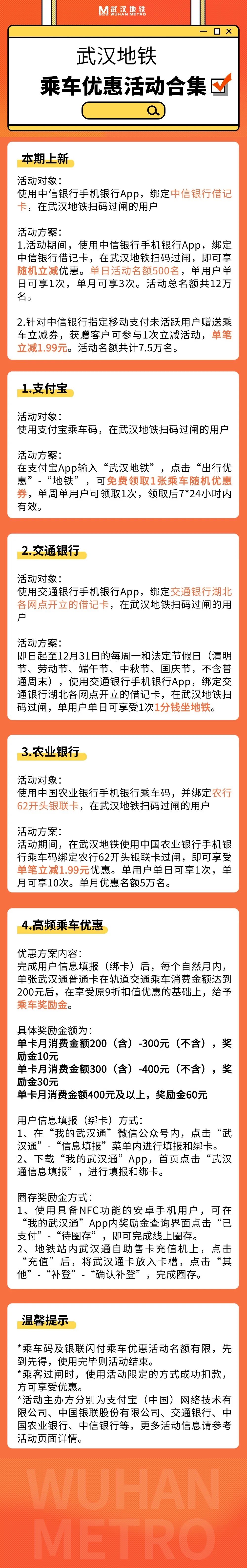 武汉地铁乘车优惠活动上新啦