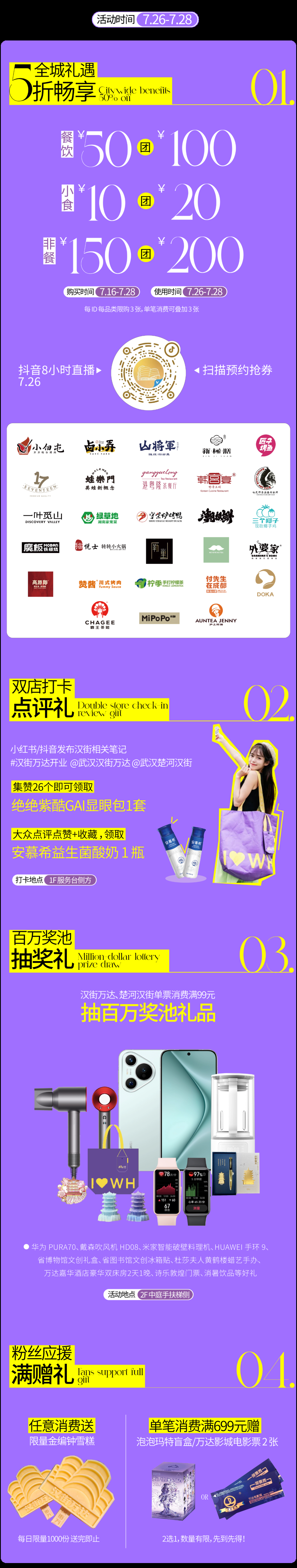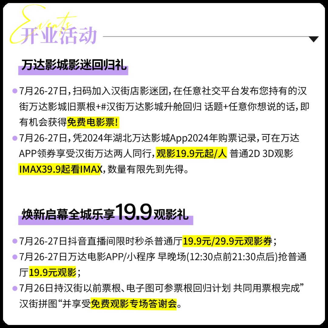 开业期间,5折畅享、打卡领礼品、华为Pura70、诗乐敦煌门票、百万抽奖礼、汉街万达限量金编钟雪糕(每日限量1000份 送完即止)、万达影城电影票等超多宠粉福利奏响江城乐章。