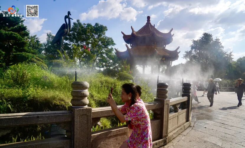 在黄鹤楼西区广场“黄鹤归来”铜雕池、主楼北面、主楼东邮局回廊、千禧钟到白云阁的山脊等5个地方,均安装了雾森系统。雾森系统8点开启,每半小时启动一次,为游客送上持续的“清凉”。