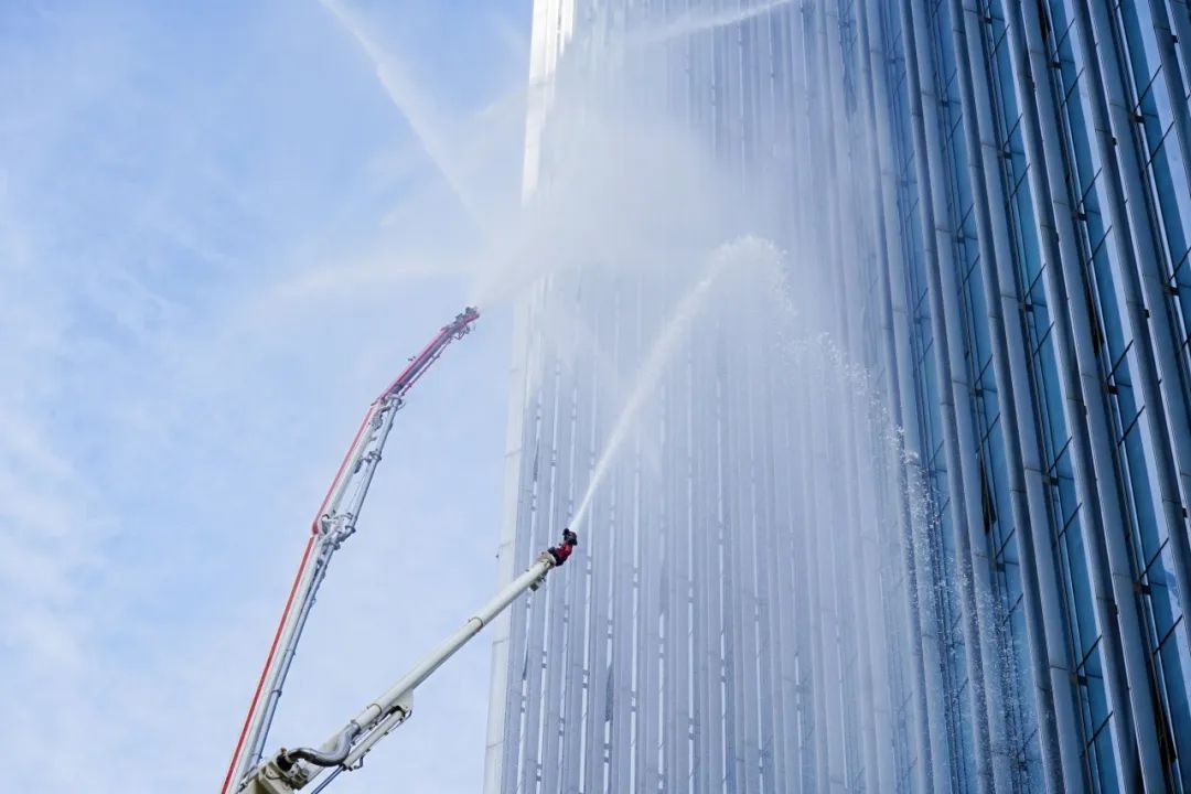 上午10时,高层建筑灭火救援实战演练在武昌区福莱中心正式拉开序幕。灭火演练模拟大楼12层发生火灾,有人员被困。接到“报警”后,区消防救援大队迅速出动6车30人赶赴现场。