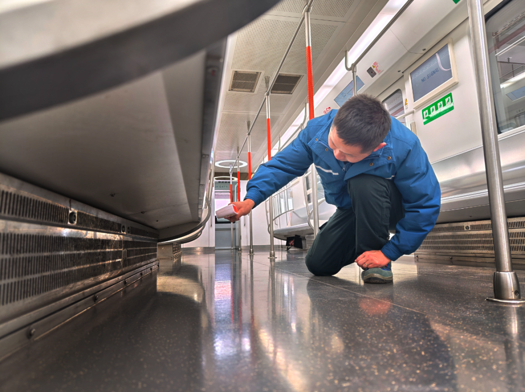 地铁列车检修人员通过点温枪确认座椅下方电暖工作状态。通讯员方正阳 摄
