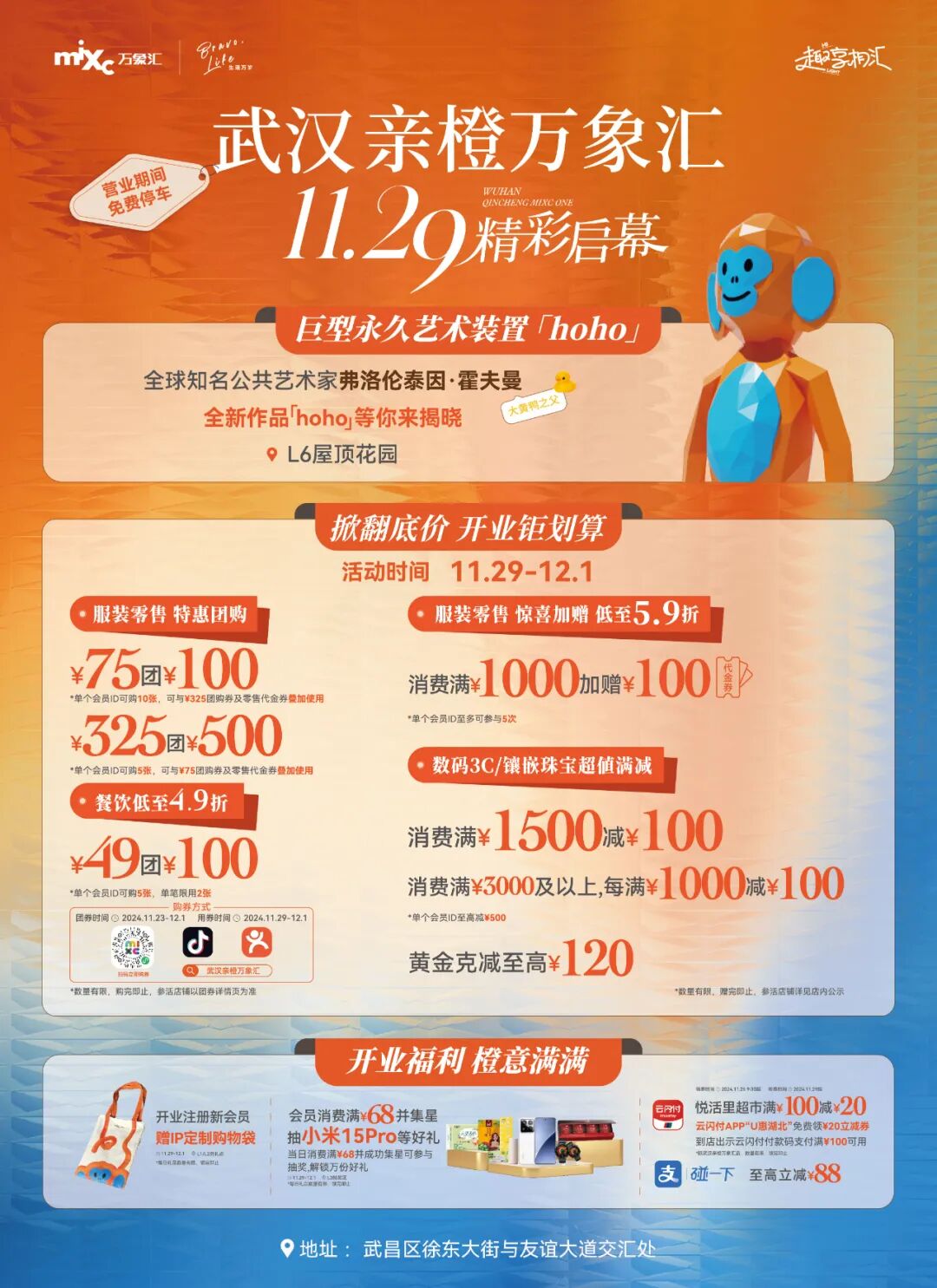 本周五,11月29日,武汉亲橙万象汇开业,就在武昌友谊大道与徐东大街交汇处,靠近徐东地铁站。