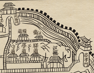 现在的三道街具体指东起胭脂路、西至司门口黄鹤楼地铁站,在民主路、粮道街之间并与其平行的一条长约590米的东西走向老街巷。得名“三道”,是因为曾经在这条街上,并排分布着三个被简称为“道”的衙门。“道”即道制,是明清地方行政制度中的重要一环,大体上可以分为管辖每一地域的分守道、分巡道,以及管理某项专门事务的“专务道”。至于三道街上的“三道”指的是驿道、学道、守道(参考康熙《湖广武昌府志》城池图)。