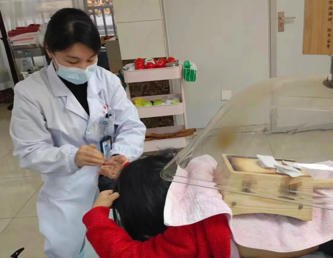 武汉市肺科医院中医科医生为儿童患者进行推拿治疗。