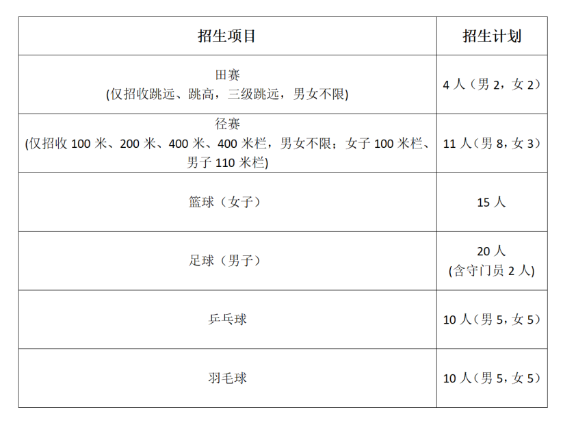 2.我校体育专项成绩录取控制线:径赛80分,田赛75分,篮球(女子)75分,足球(男子)80分,乒乓球70分,羽毛球70分。