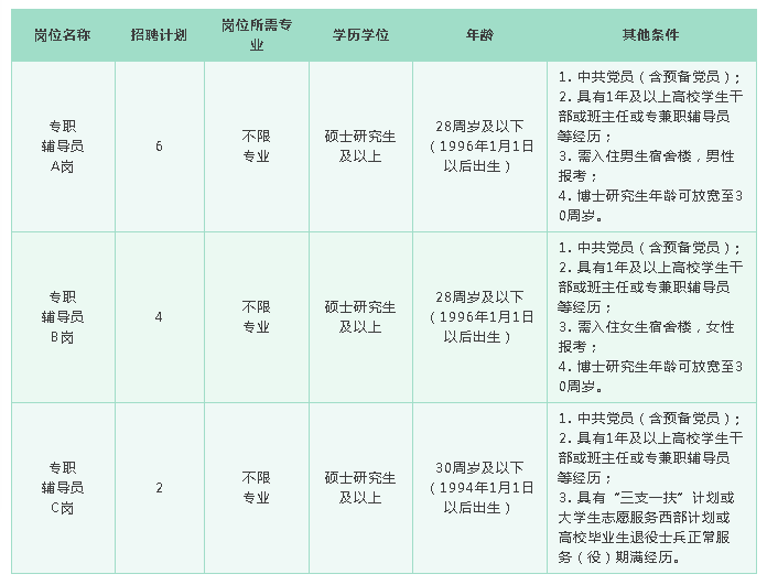 根据学校事业发展需要,现面向社会公开招聘专职辅导员12人,具体岗位及条件详见下表。