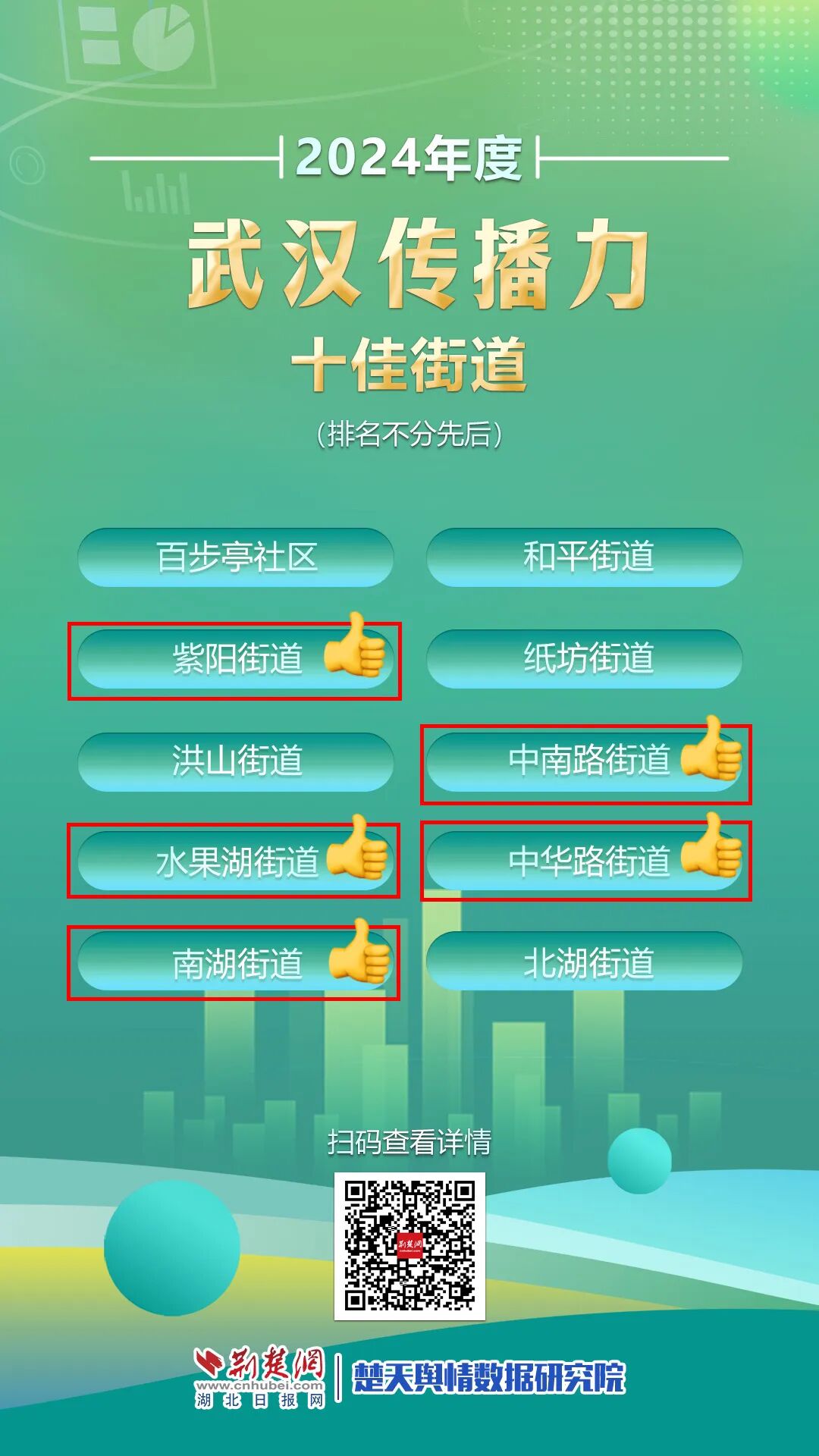 2月27日,荆楚网(湖北日报网)、楚天舆情数据研究院发布2024年度武汉传播力十佳街道榜单,其中,武昌区5个街道上榜:中华路街道、紫阳街道、中南路街道、水果湖街道、南湖街道。