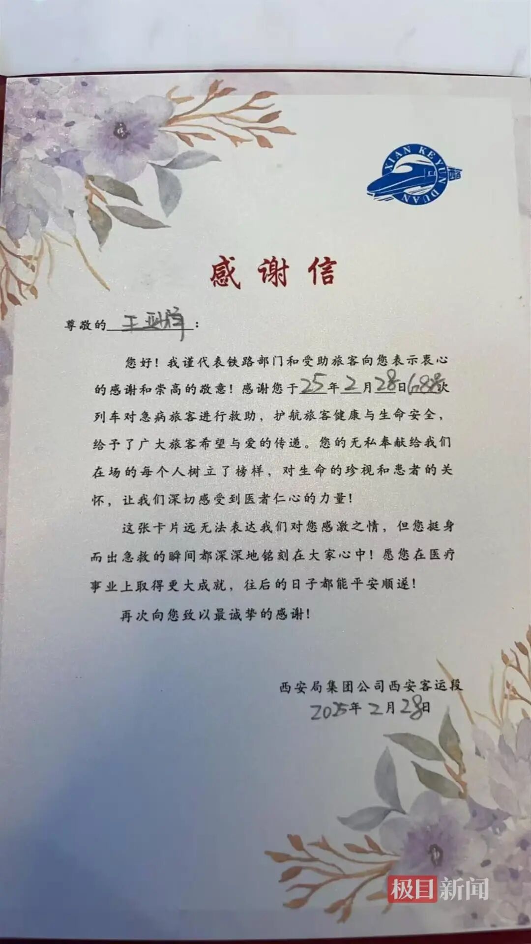 当天,列车工作人员为王亚娟送来了感谢信,信中写道:“感谢您对急病旅客进行救助,您挺身而出急救的瞬间深深地铭记在大家心中……”对此,42岁的王亚娟也表示十分感动,“当得知有人需要帮助,我当时什么都没想,条件反射地站了起来,只想赶紧过去帮忙。治病救人是医务工作者的本分,我只是做了我应该做的事情。”