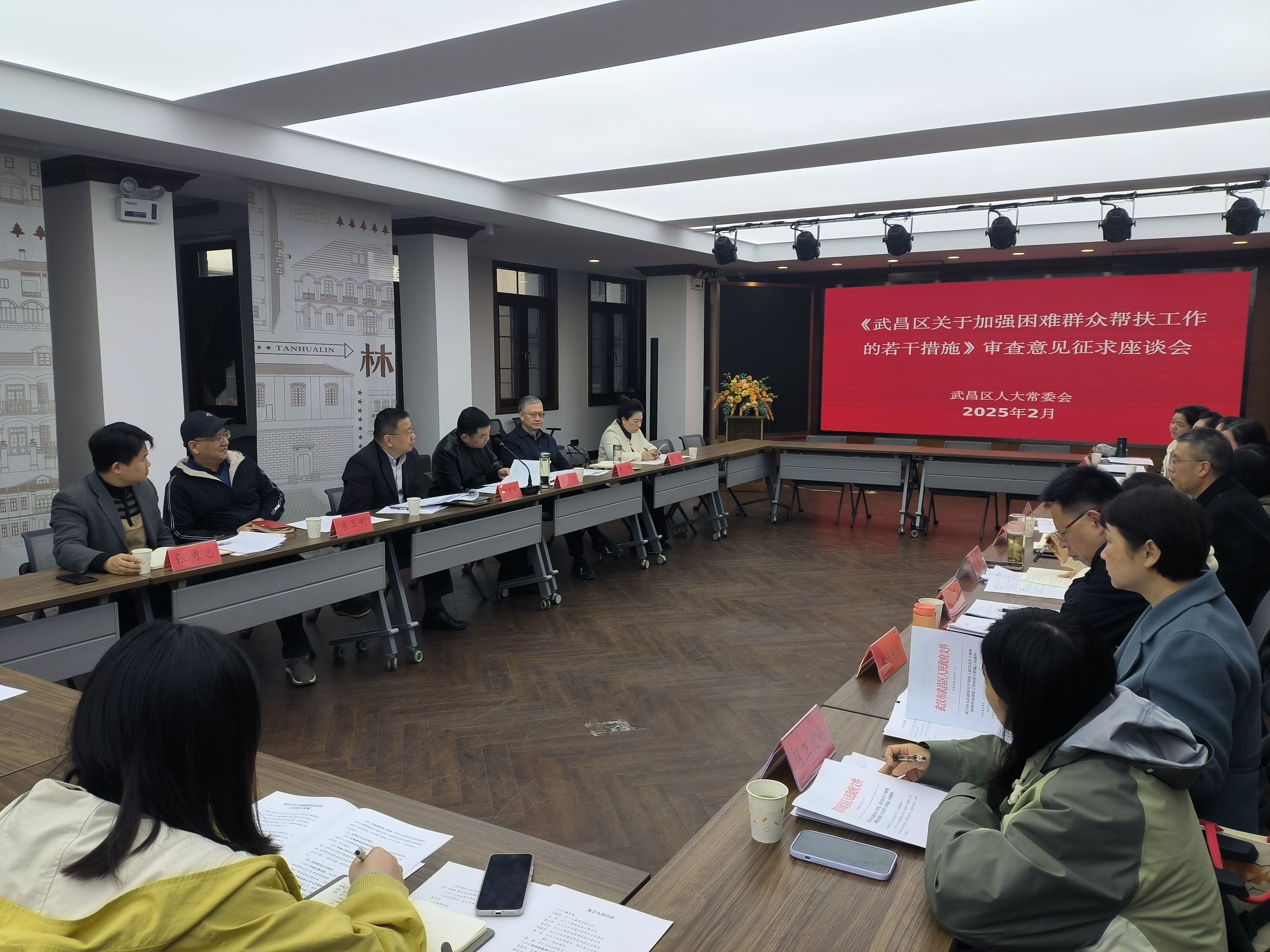 2月28日下午,武昌区人大首次在基层备案审查联系点粮道街道昙华林社区,开展规范性文件审查意见征求活动,就《武昌区关于加强困难群众帮扶工作的若干措施》(以下简称《若干措施》)征求审查意见。区人大常委会相关负责人,区人大办、区人大社会委、区人大常委会粮道街道工委主要负责人,部分区人大社会委委员,区残联、区民政局、区司法局、区卫健局、粮道街道负责人,社区代表共20余人参加。