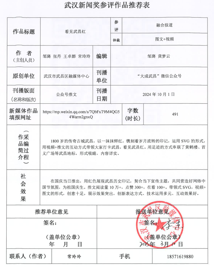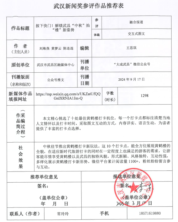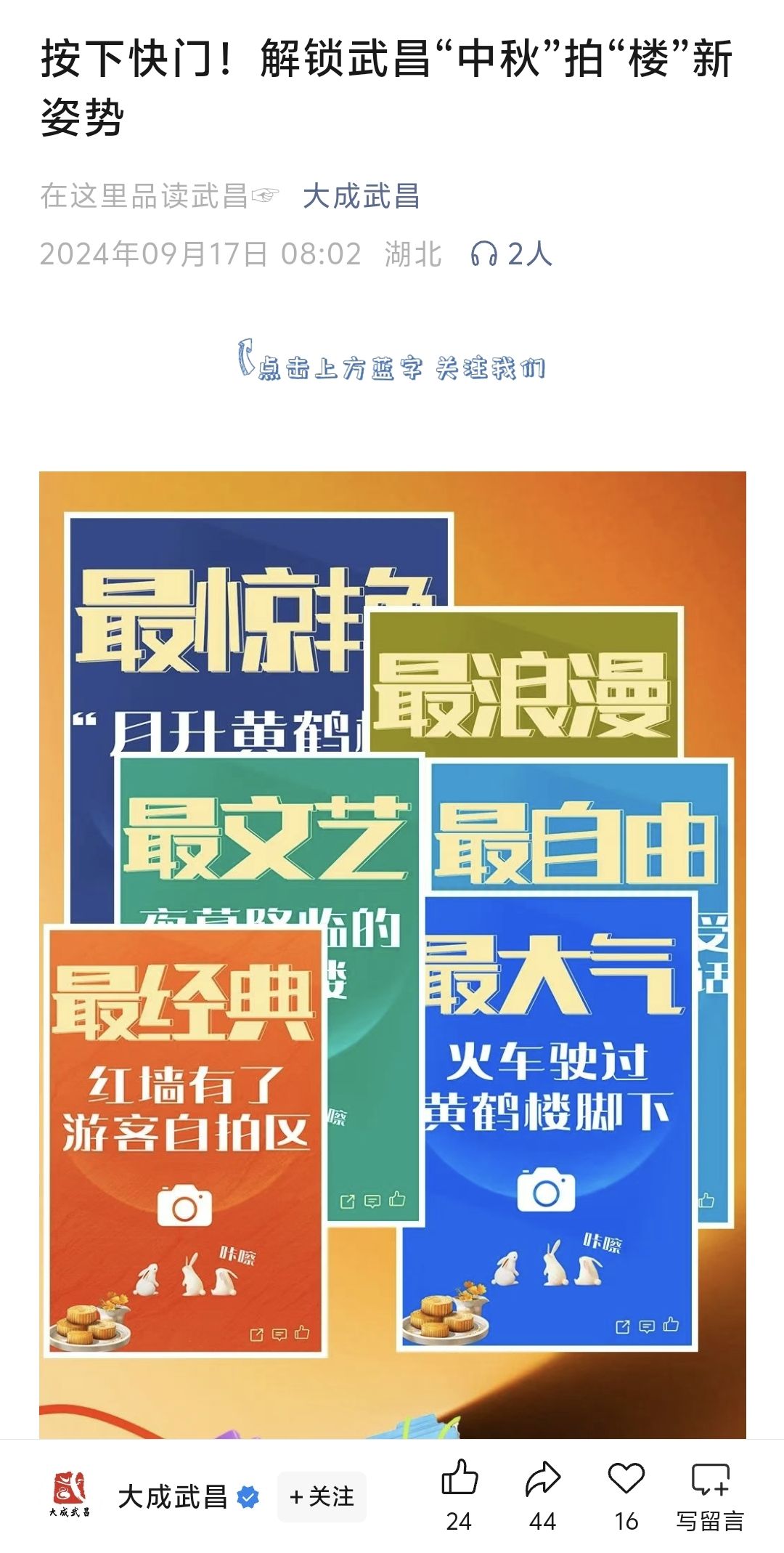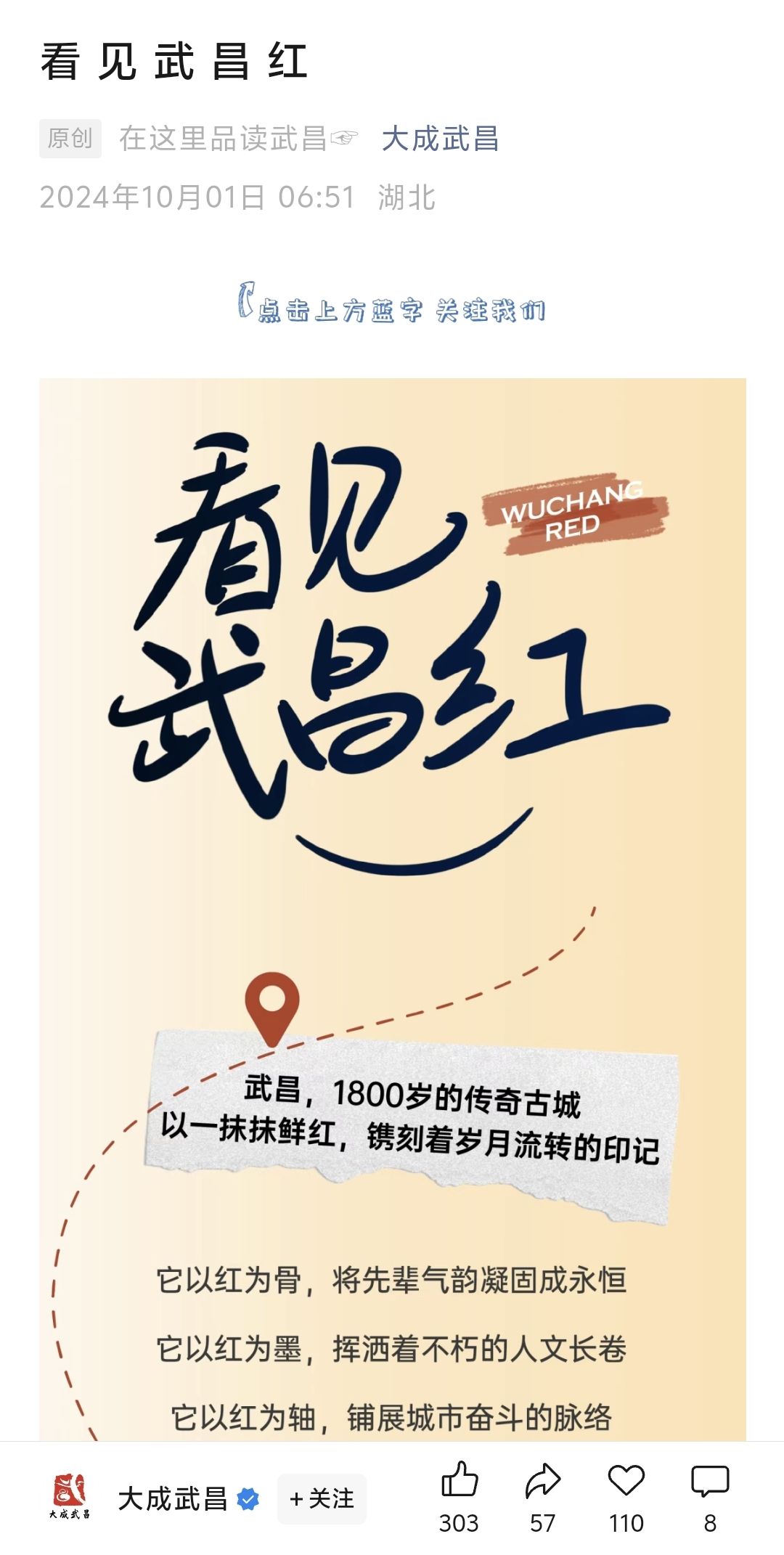 根据武汉新闻奖参评作品相关要求,“大成武昌”微信公众号于2024年3月23日发布的《汉马:奔跑中的“武昌奇遇记”》、2024年9月17日发布的《按下快门!解锁武昌“中秋”拍“楼”新姿势》、2024年10月1日发布的《看见武昌红》和2024年12月30日发布的《武昌⇌未来,开启盲盒》,拟自荐参评第三十三届武汉新闻奖作品初评,现予以公示。
