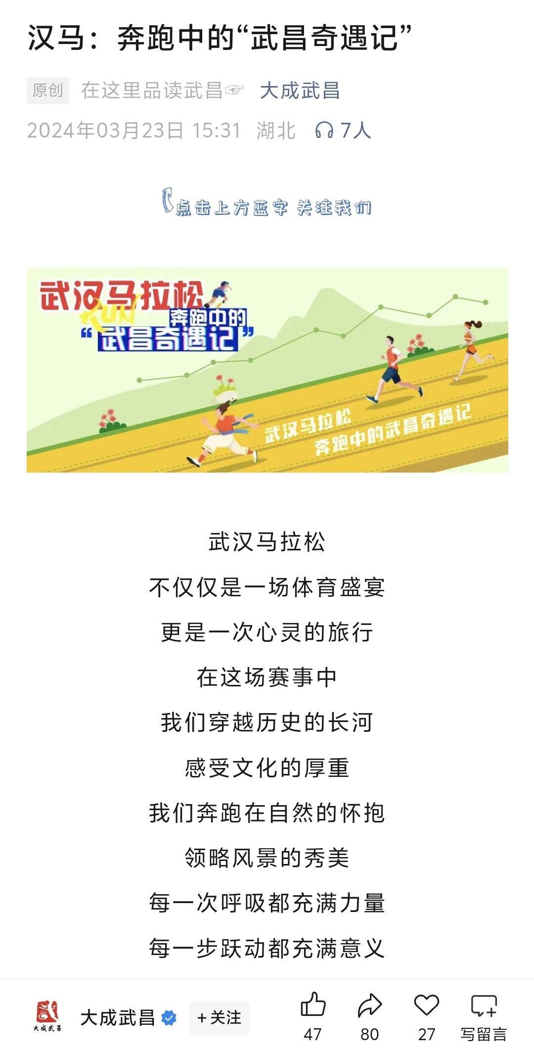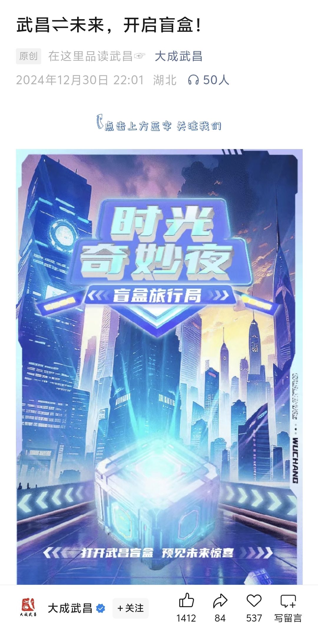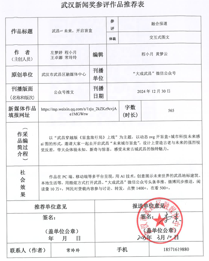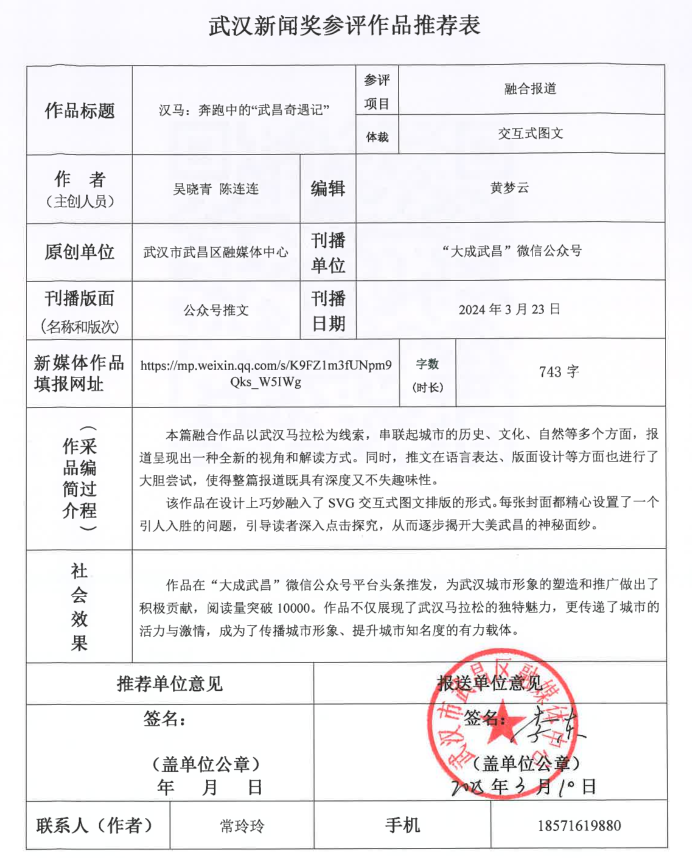 根据武汉新闻奖参评作品相关要求,“大成武昌”微信公众号于2024年3月23日发布的《汉马:奔跑中的“武昌奇遇记”》、2024年9月17日发布的《按下快门!解锁武昌“中秋”拍“楼”新姿势》、2024年10月1日发布的《看见武昌红》和2024年12月30日发布的《武昌⇌未来,开启盲盒》,拟自荐参评第三十三届武汉新闻奖作品初评,现予以公示。