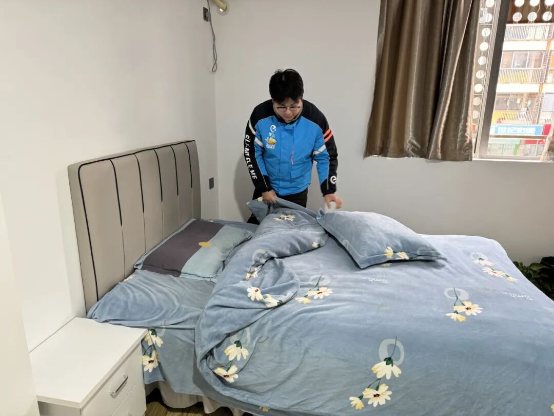早会结束后,关高杰回到公寓。房间内共4个人居住。虽然陈设不多,但空调,无线网络等基本设施均有配备。关高杰将物品轻轻放在床位上后,拿着扫帚在床位下扫了两圈,没有吵醒昨晚上夜班的室友。“大家习惯不一样,我一般负责房间卫生,在这里生活就像学生宿舍一样,室友们共同话题很多,闲下来就聊聊天。”关高杰笑着说,跑单班次一般由站长提前一周排好,一天能跑50单左右,每月能赚约6000元,勤快点一个月能拿到近万元。