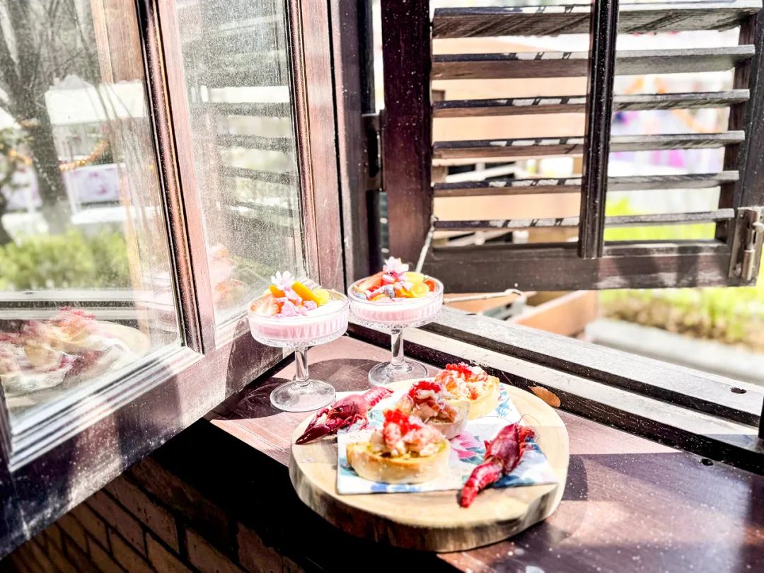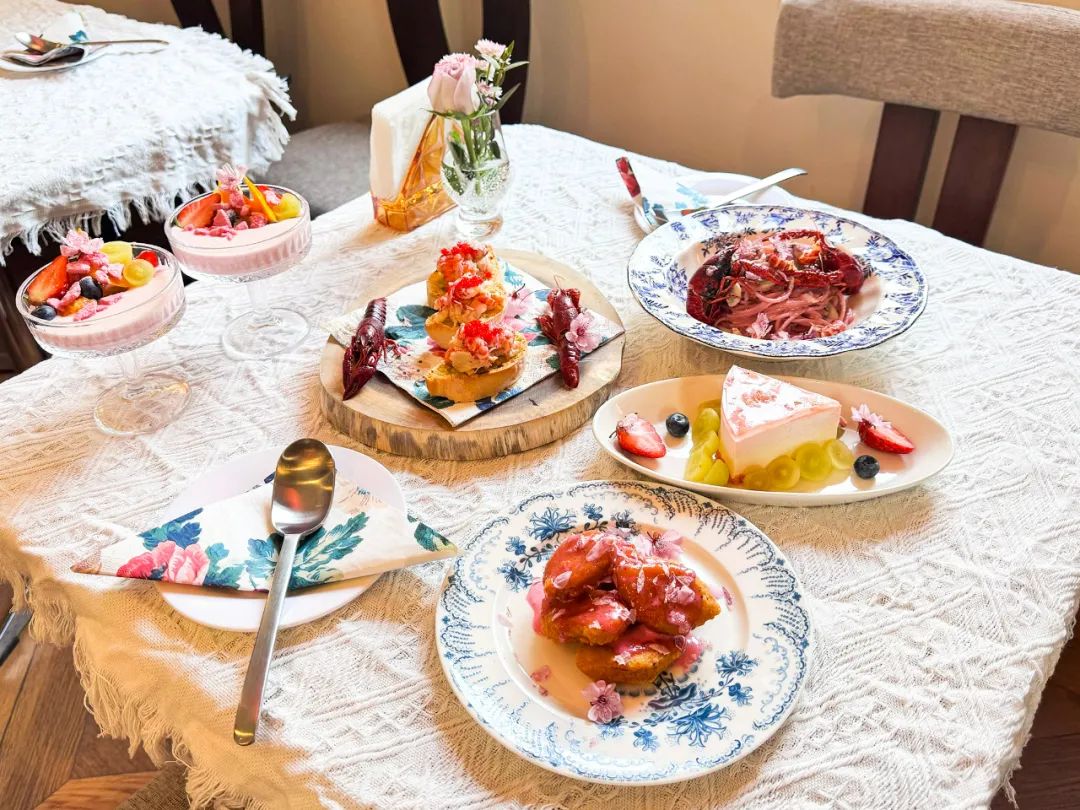 今年除了樱花糕点备受青睐外,不少商家借助樱花的火热,迅速推出了樱花餐食,也十分受游客欢迎。昙华林N.Ice冰淇淋创意鸡尾酒吧的樱花限定餐品,大胆地将小龙虾与关山樱花碰撞在一起,创意烹饪出樱花鱼子酱配煎小龙虾、樱花粉脆炸云吞、意式手作冰淇淋配樱花限定奶冻和小龙虾薄脆等12道特色菜品。