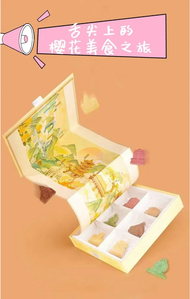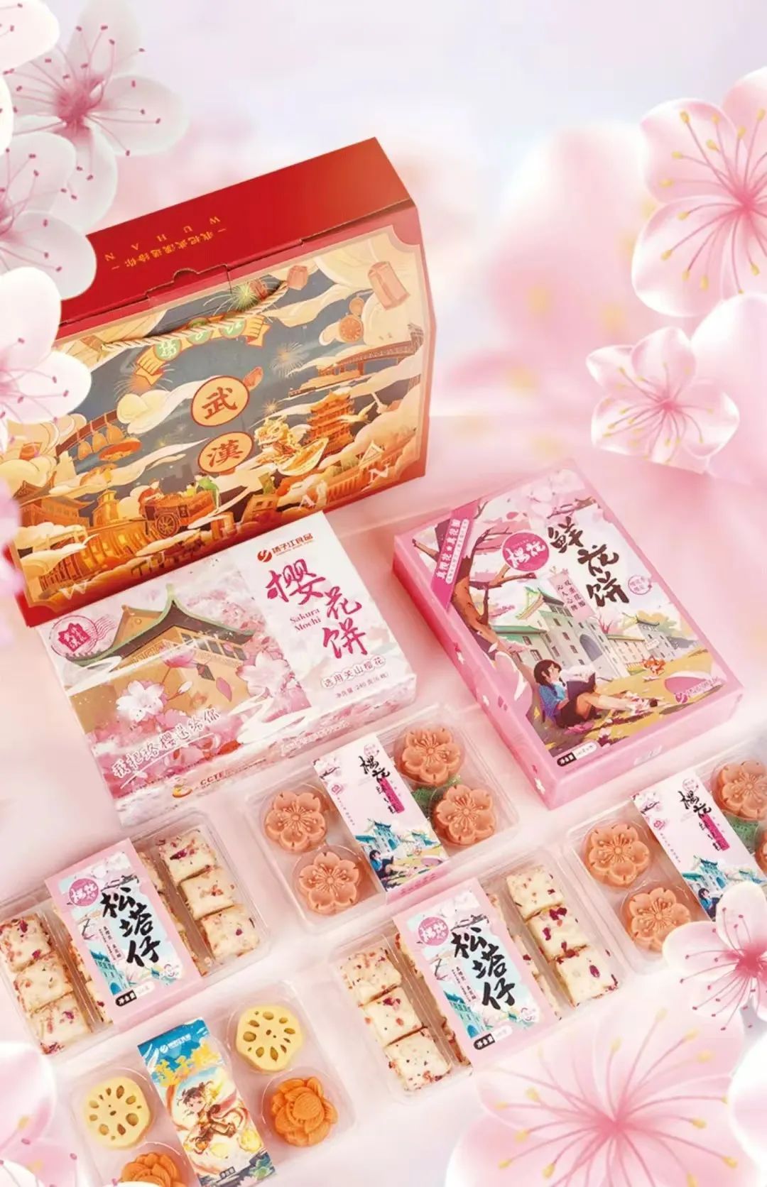 一盒4种糕饼,口感丰富,老少皆宜。无论是自备出游野餐,还是当做旅行伴手礼送亲友,都是不错的选择。在礼盒包装上,设计师也融入了巧思。渐变粉不规则的礼盒采用非遗剪纸艺术文化,将武汉地标黄鹤楼、武汉长江大桥、江汉关等地标巧妙绘进其中,周围点缀朵朵盛放的樱花,呈现花团锦簇的画面。而等你将视野稍微拉远一点,则会发现这是一个花环的形状。