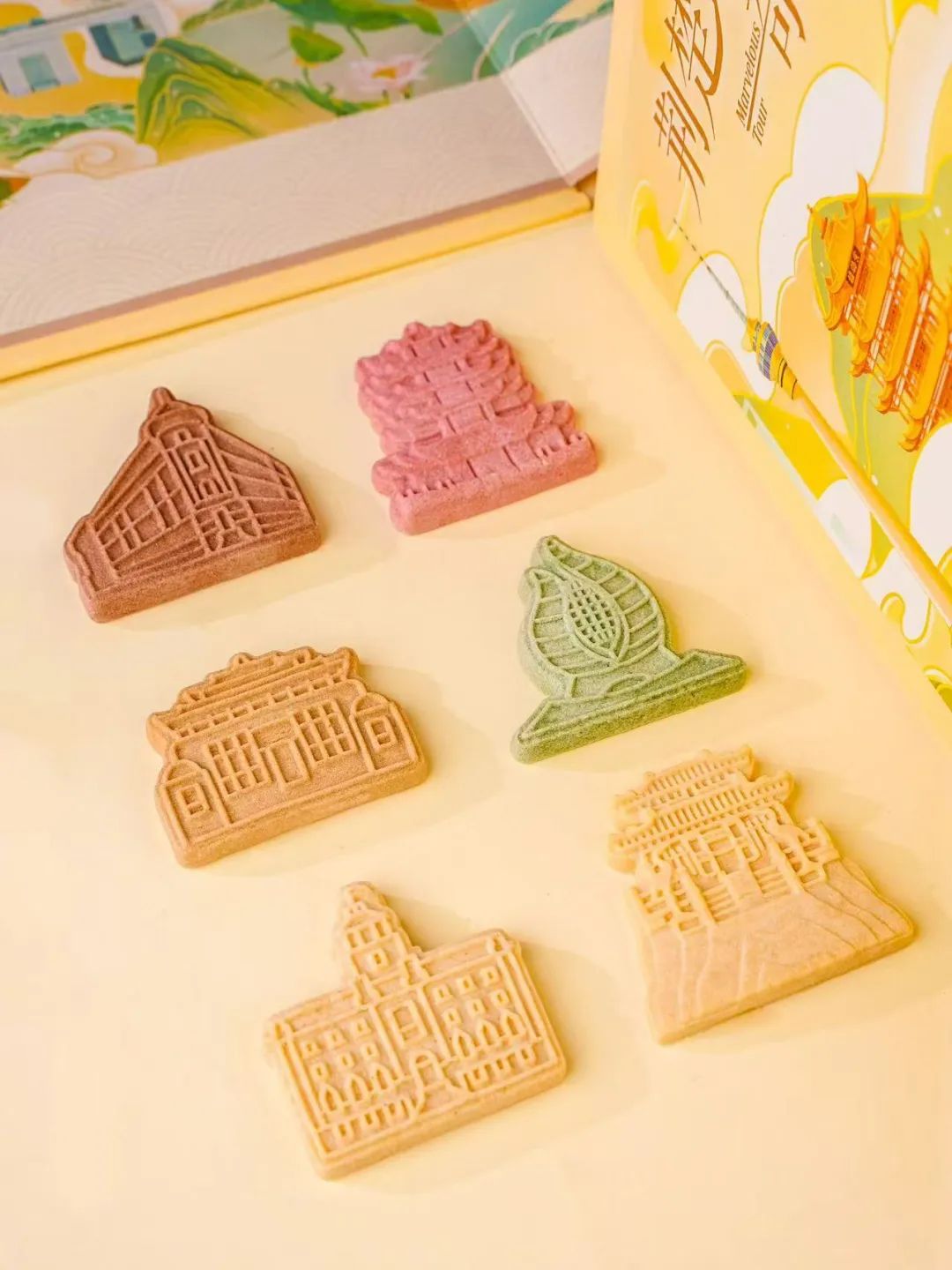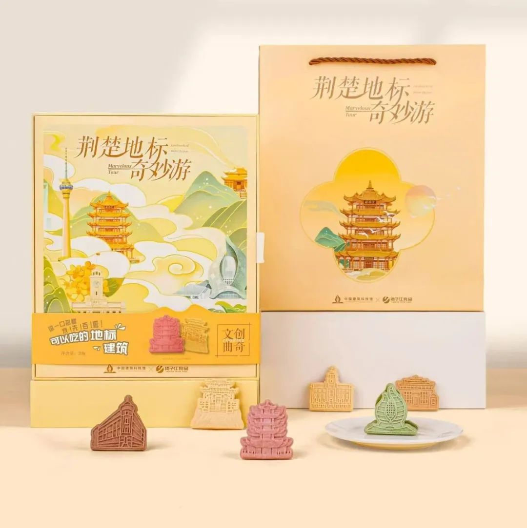 这款曲奇礼盒中有24个曲奇,分为6种造型、颜色、口味。仔细一看,黄鹤楼、武汉大学、巴公房子、江汉关、中国建筑科技馆、武当山金顶都被精雕细琢成糕点,每一眼都是城市文化,每一口都是地标打卡点。