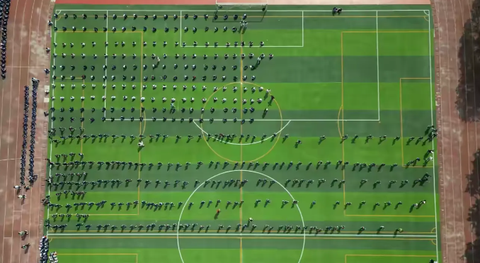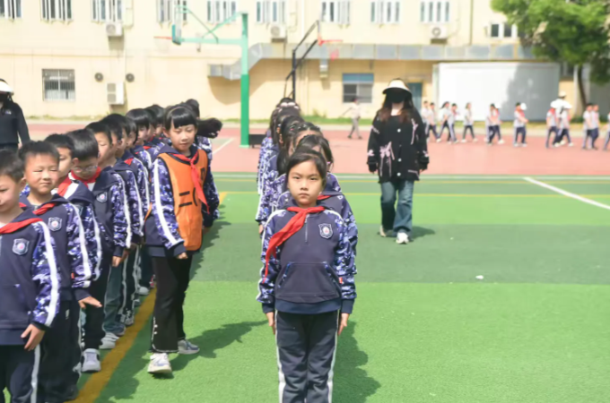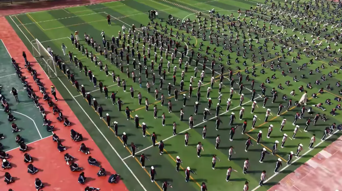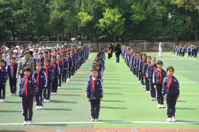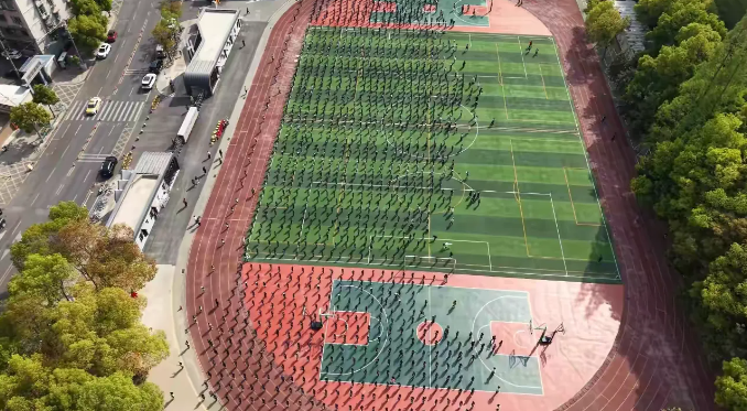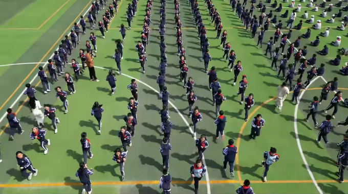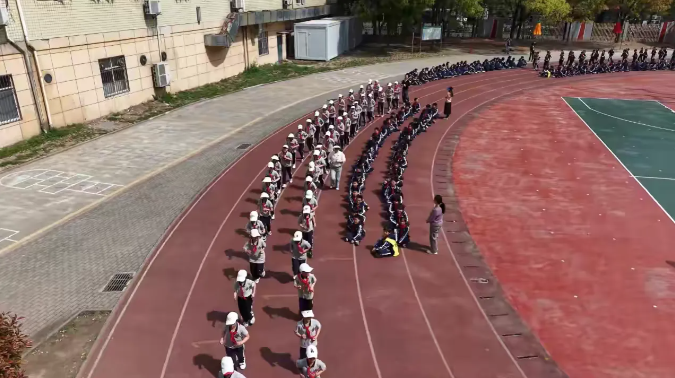 在体育老师及校领导干部们的精心指导下,历时一个多月的学习和训练,各年级的集结号已在校园上空吹响。数百名学生组成的方阵如同一幅巨大的网格画作,展现了团队合作与纪律的力量。小路延伸至远方,象征着无限可能!