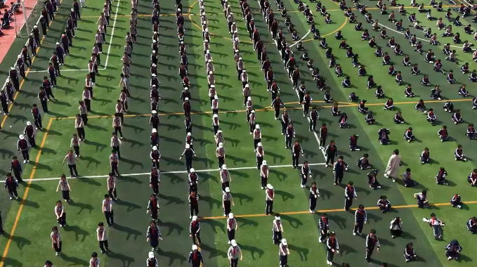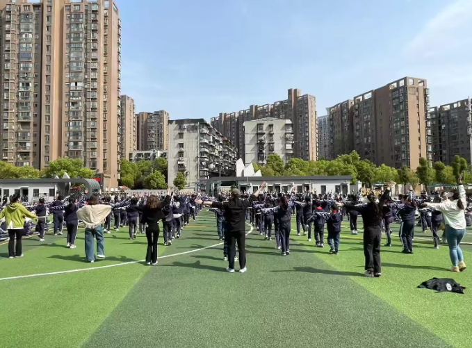明媚的阳光下,全体同学在绿茵场上整齐列队,每一个动作都精准到位、刚劲有力。他们精神抖擞、朝气蓬勃,整齐划一的动作如波浪般起伏,展现出少年特有的青春活力与昂扬风采。