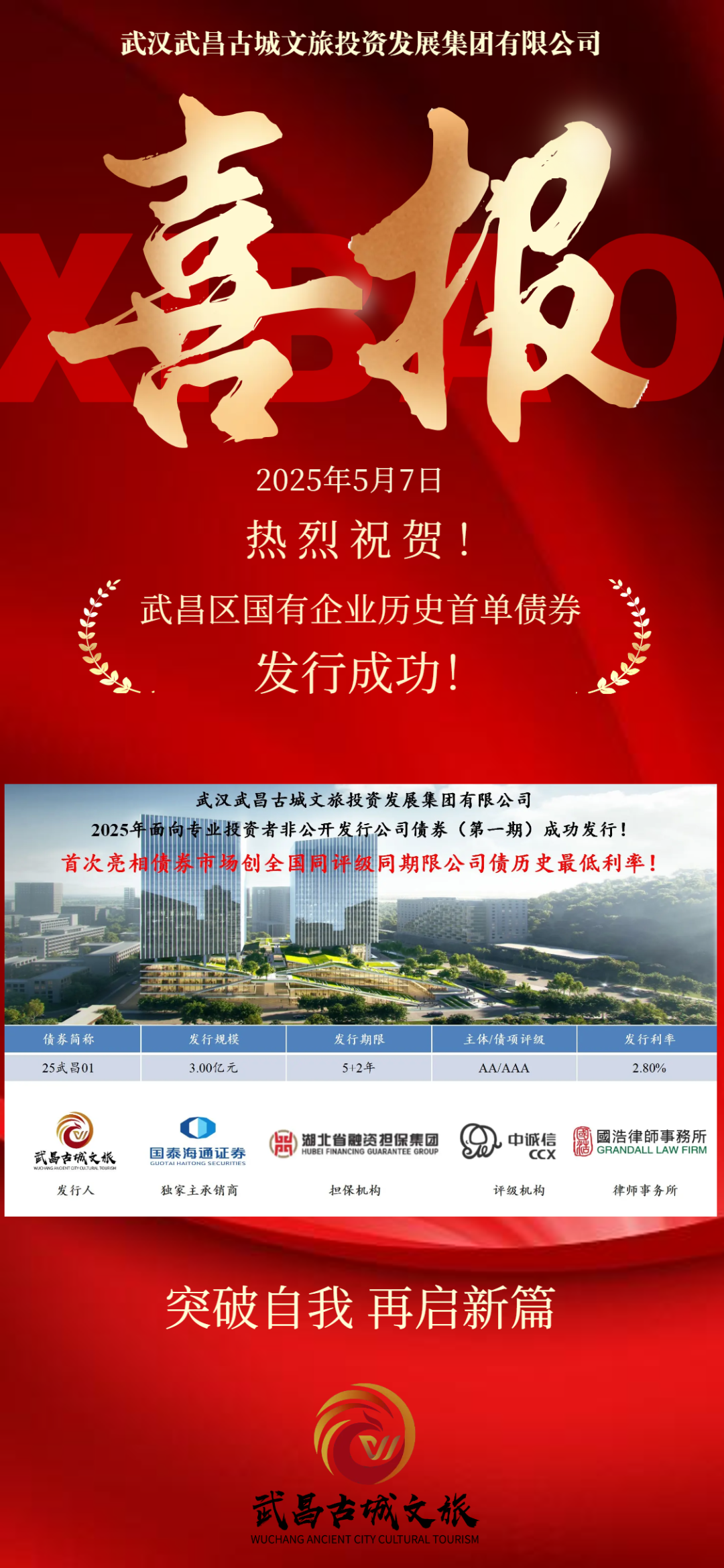 5月7日,武汉武昌古城文旅投资发展集团有限公司2025年面向专业投资者非公开发行公司债券(第一期)成功发行!这是武昌区国有企业发行的首单公司债券,标志着古城文旅集团在资本市场上迈出里程碑式的一步,也为区域经济发展注入强劲动能!