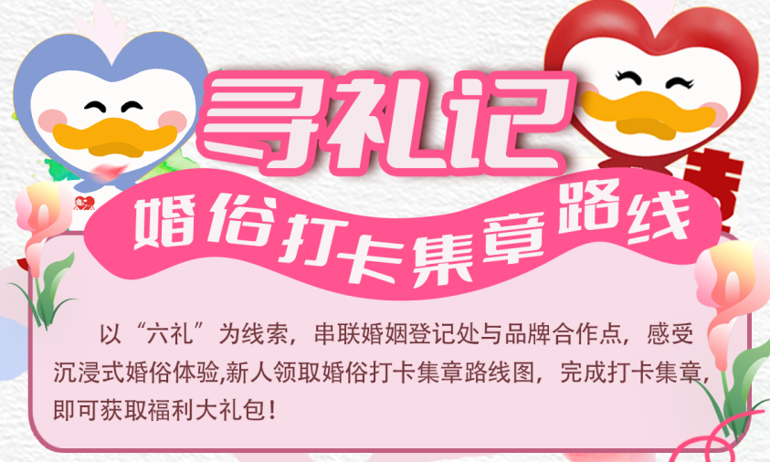 活动内容:“婚俗新风寻礼记”打卡集章活动,还原“纳采—问名—纳吉—纳征—请期—亲迎”传统六礼,新人完成集章即可兑换礼品。