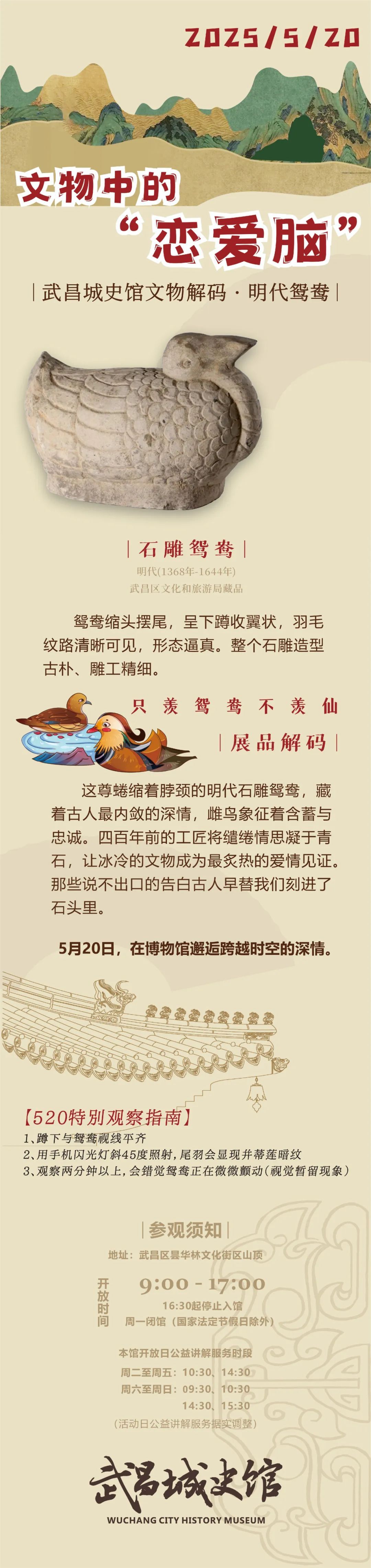 活动内容:前往昙华林武昌区城史馆、打卡明代石雕鸳鸯,在博物馆邂逅跨越时空的深情——那些说不出口的告白,古人早替我们刻进了石头里。