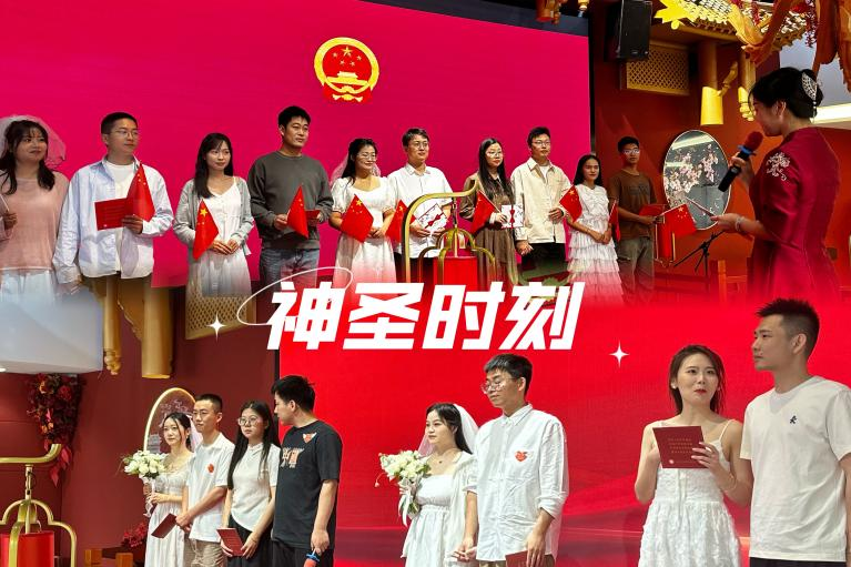 活动内容:新人们将在最新上线的“古城今缘 楚天新辞”中式现代颁证大厅,在国旗和国徽的见证下共同许下相守一生的誓言。将由武汉民政职业学院志愿者为新人主持集体颁证仪式,并提供免费拍照服务。