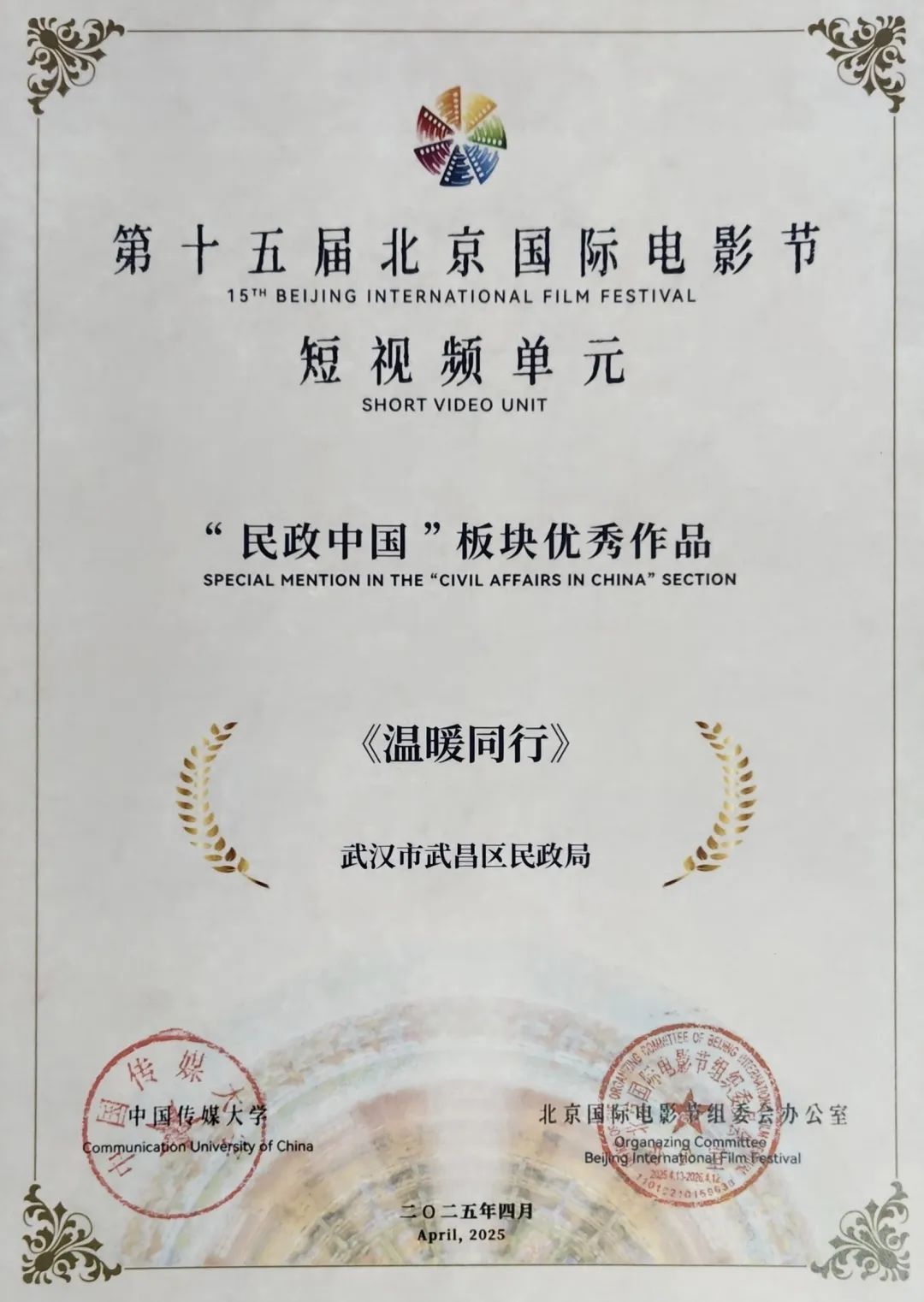 近日,武昌区民政局报送的社会救助宣传片《温暖同行》荣获第十五届北京国际电影节短视频单元“民政中国”板块优秀作品。