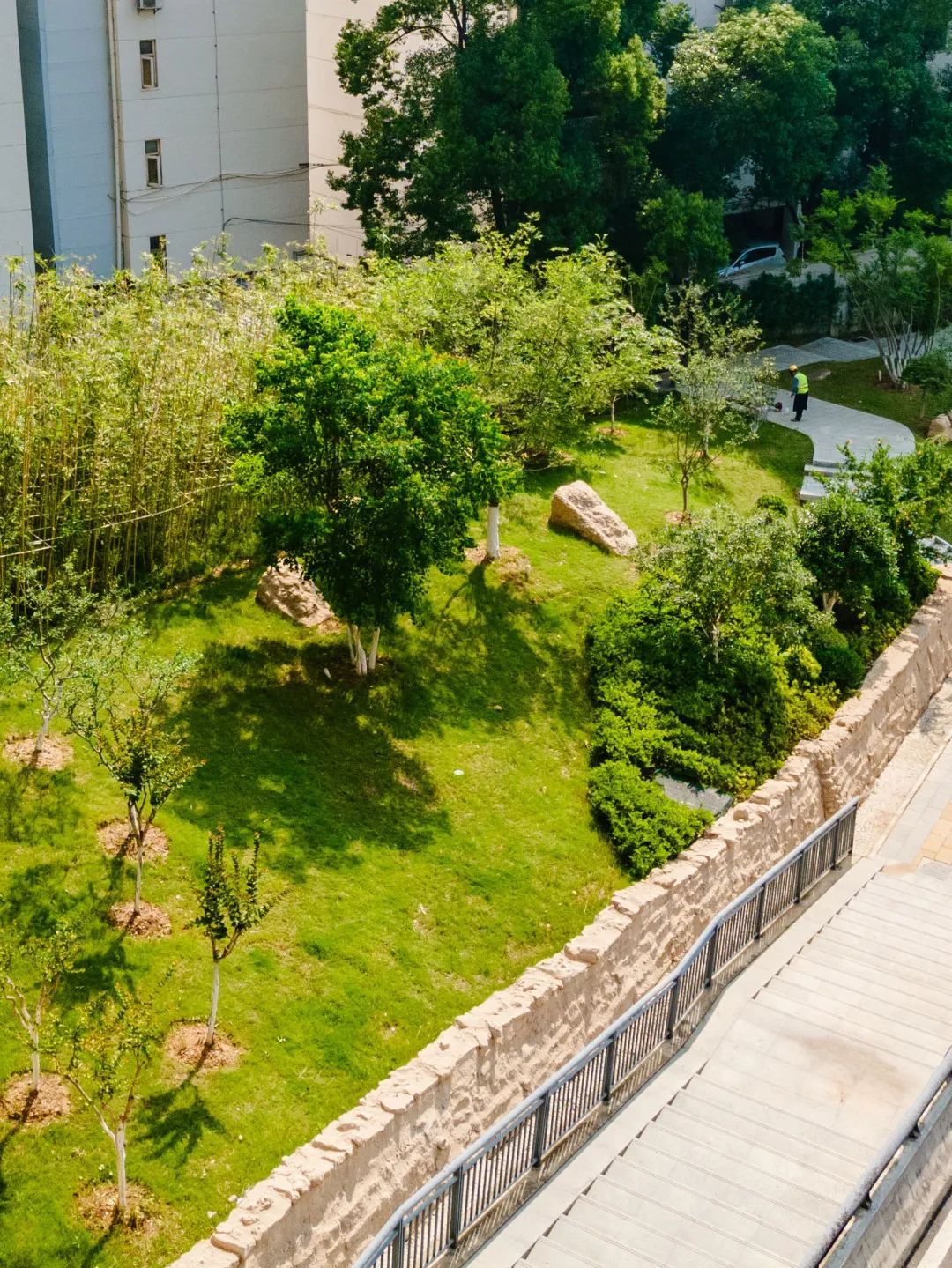 汉阳门花园以原有大乔木为骨架,增植蜡梅和石榴,辅以中式仿古风格为设计基调,搭配花岗岩、仿古砖等古朴的铺装材料,以及仿古城墙砖砌的景观小品,让人仿佛穿越回那个质朴而繁华的时代。