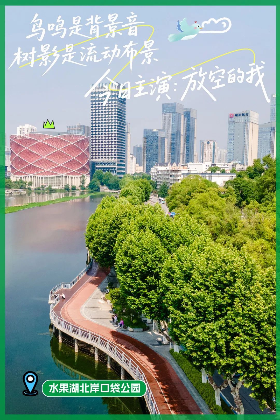 如果说汉秀剧场口袋公园是镶嵌在水果湖南岸的明珠,那简洁、大气的「水果湖北岸口袋公园」则是一串翡翠,将湖光山色串联成一幅流动的画卷。
