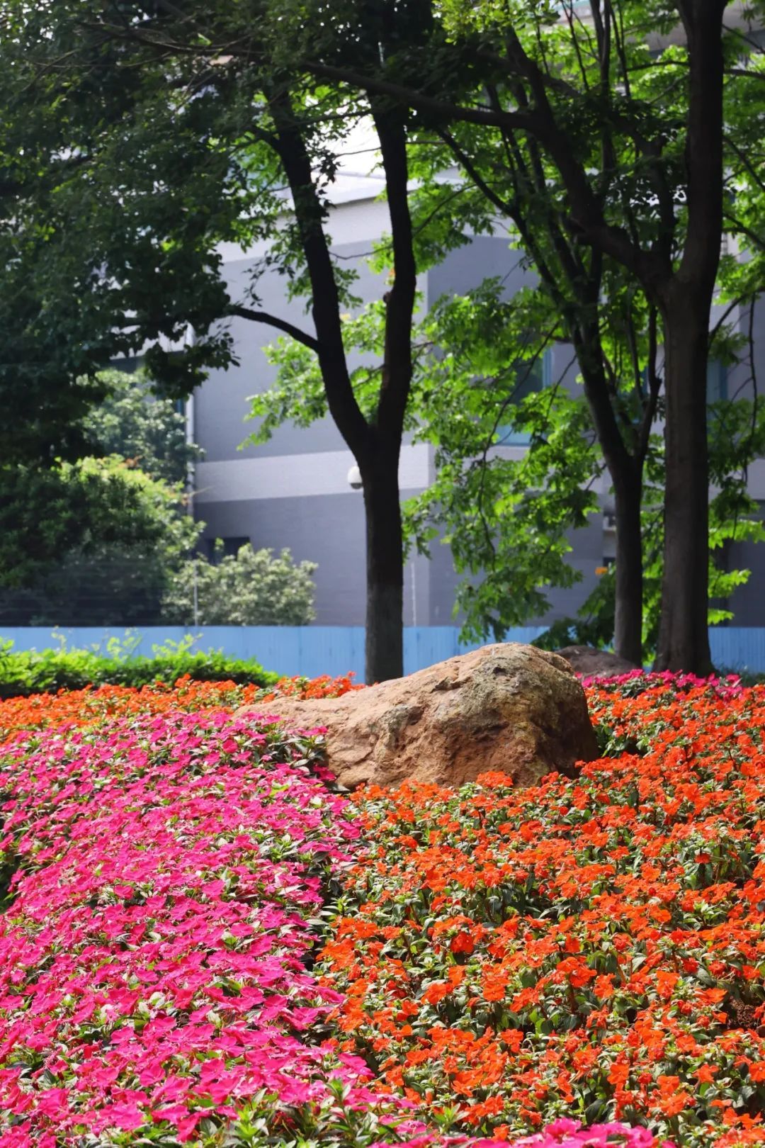 公园外侧的花园景观是最先映入眼帘的亮点。这里种植的各种花卉,形成了渐变的花色景观,从红到橙,不同颜色的花朵相互交织。