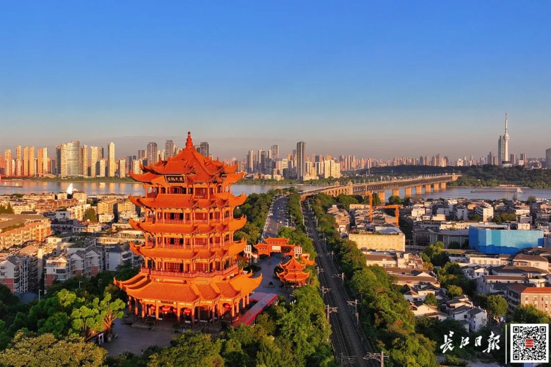 武汉长江大桥武昌桥头堡与黄鹤楼同框。记者胡冬冬 摄
