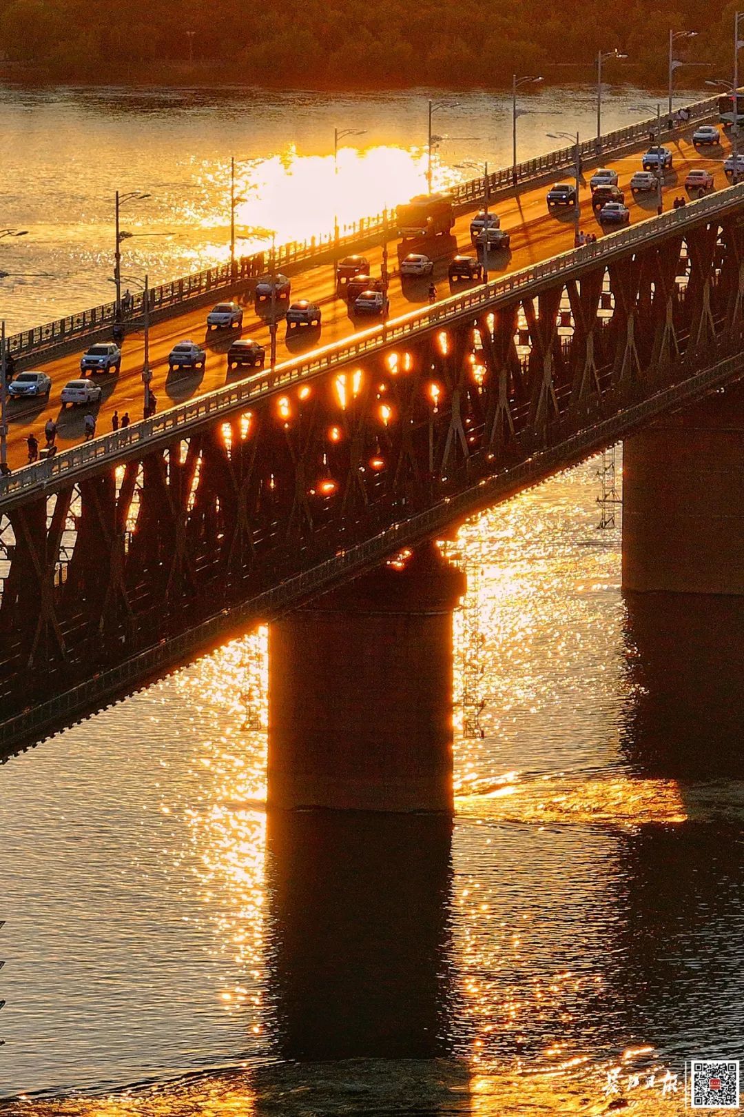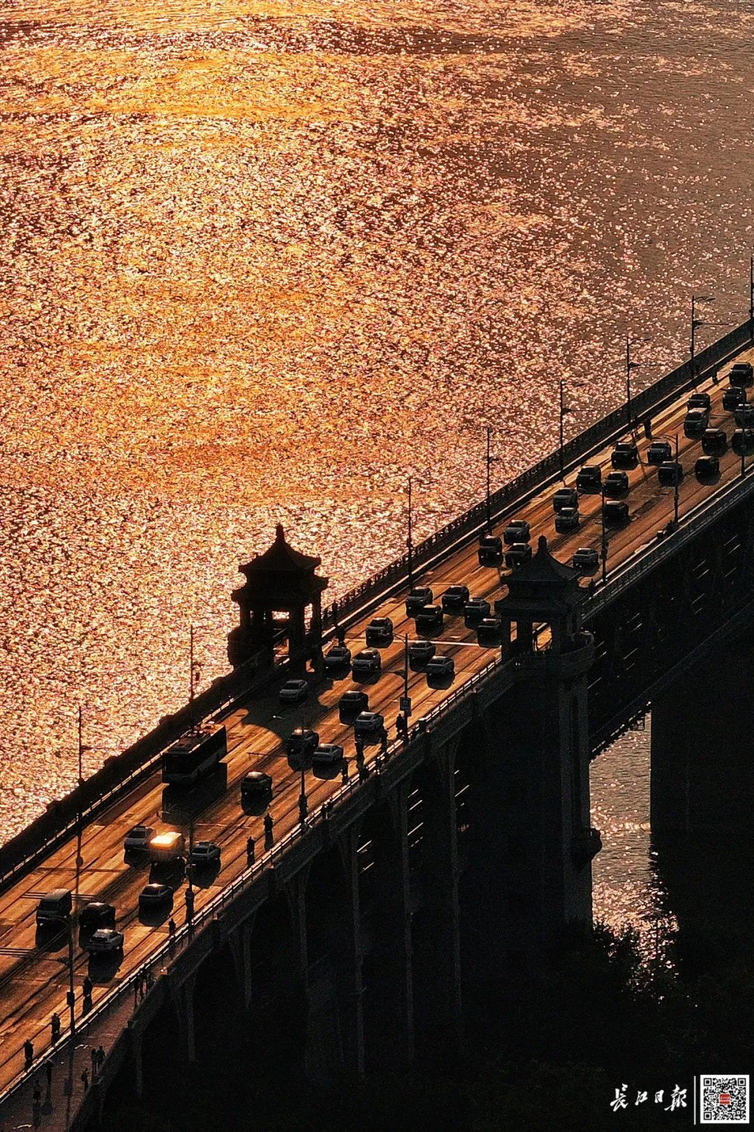 夕阳下,汽车行驶在武汉长江大桥上,桥面熠熠生辉。记者胡冬冬 摄
