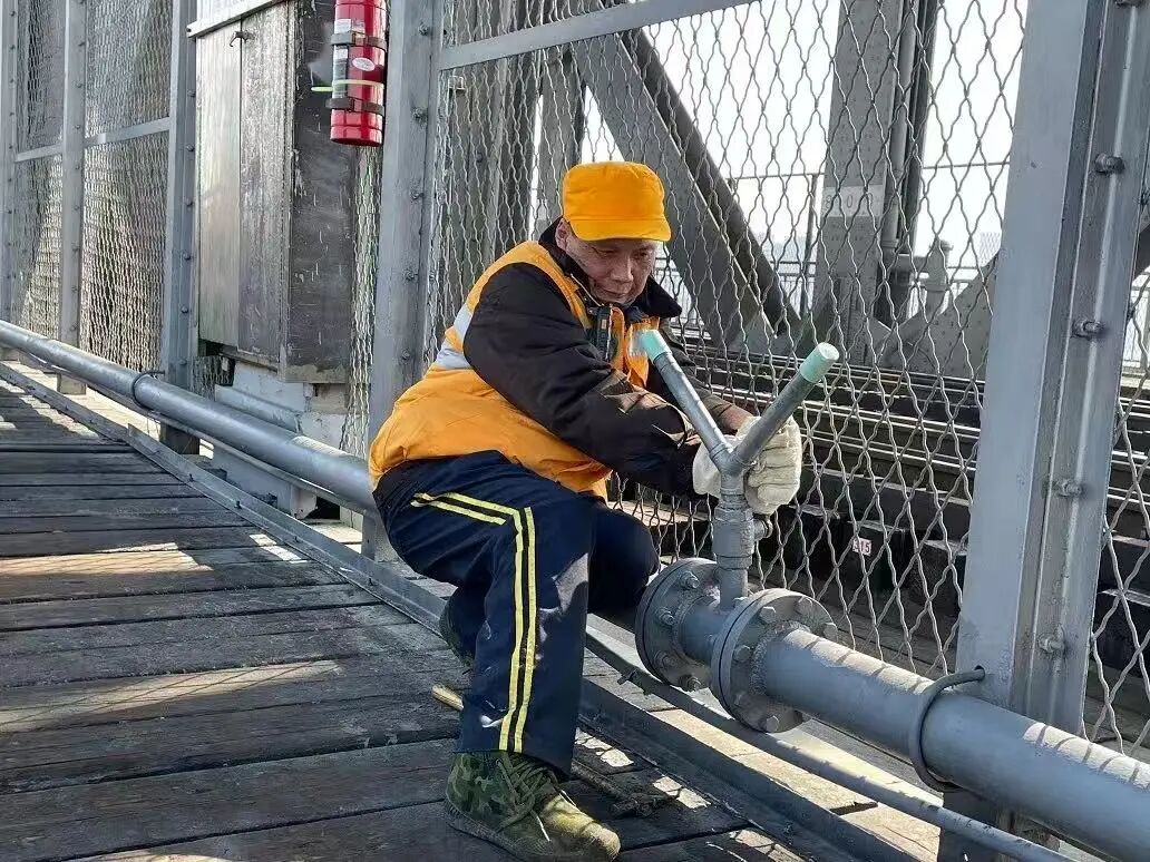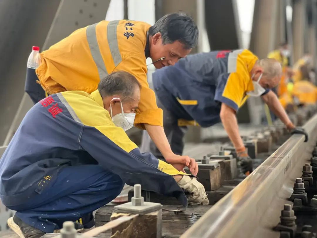 55岁的工区班长胡建刚在大桥上一干就是30多年,作业时,他腰间总要挎一个小包,里面装着轨温表、卷尺等工具,这是他多年养成的职业习惯。日常巡逻,他会格外注意桥面是否有异物、钢轨是否有异常、扣件是否松动。胡建刚几乎触摸过大桥的每一颗铆钉,如今百万颗铆钉无一松动。