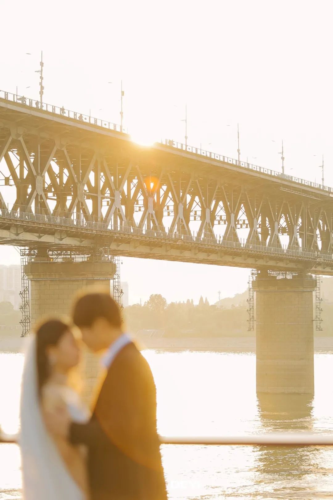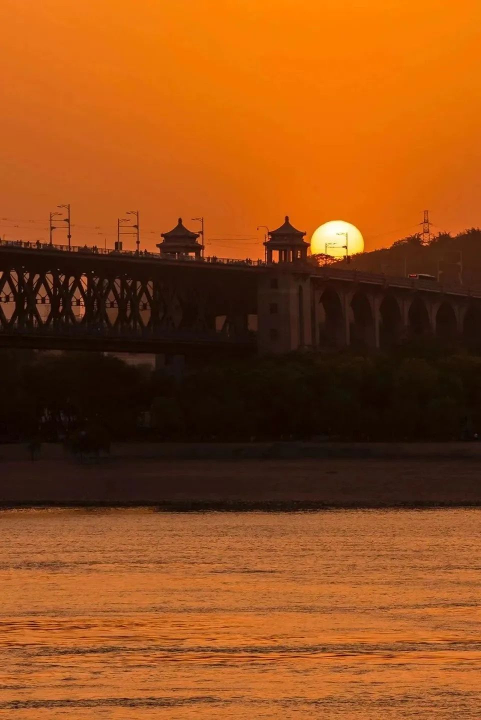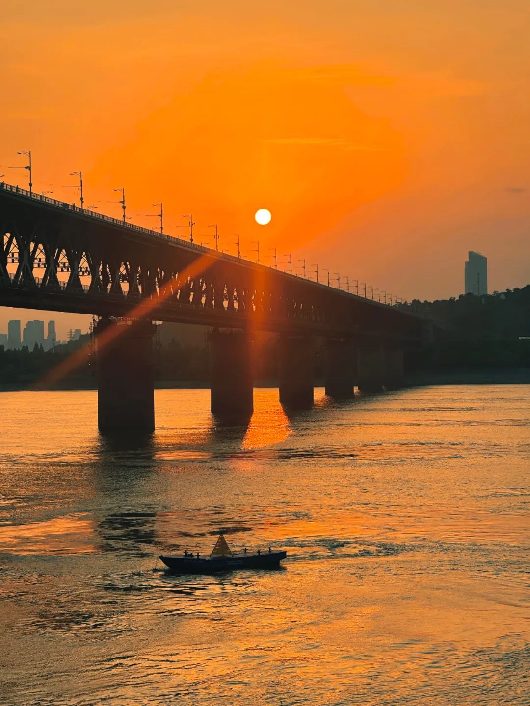 余晖洒下,大桥被染上一层暖金色的光,金红色的光洒满江面,真的就是传说中的 “橘子海”! 波光粼粼,美到窒息。
