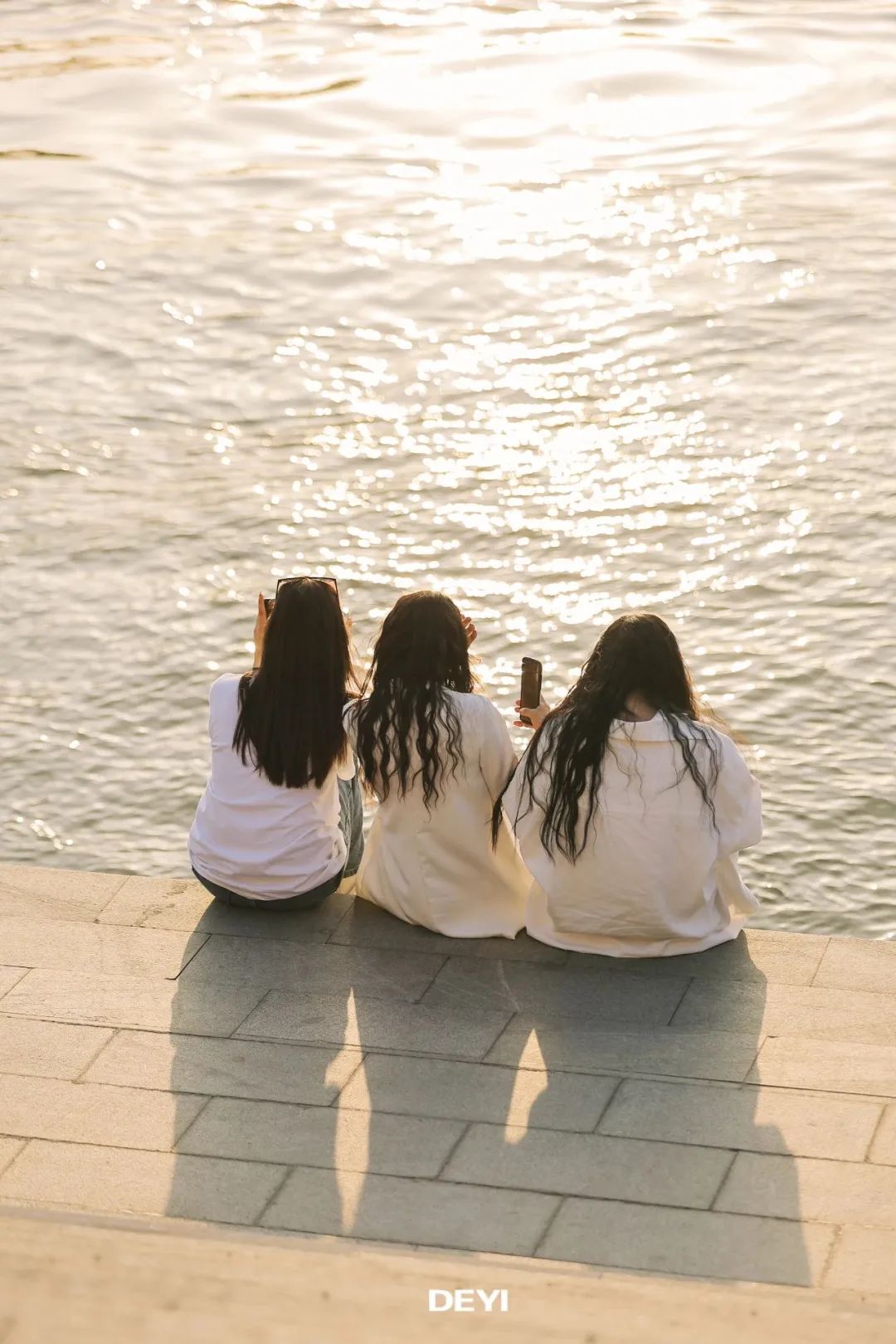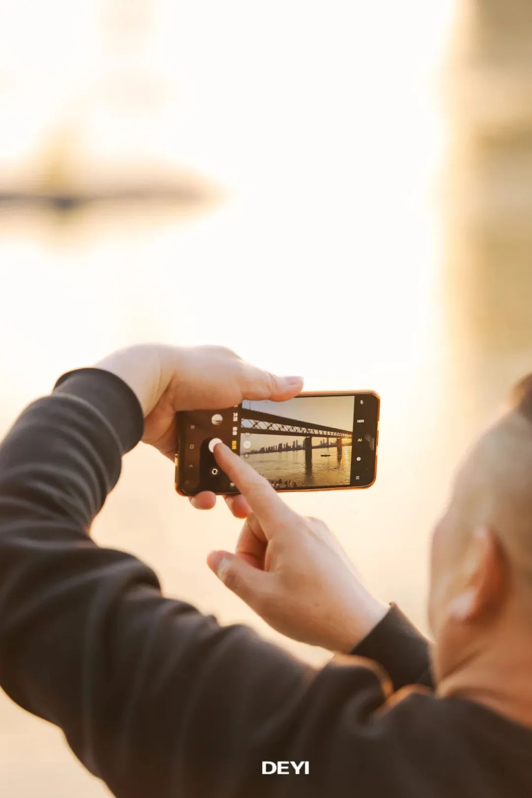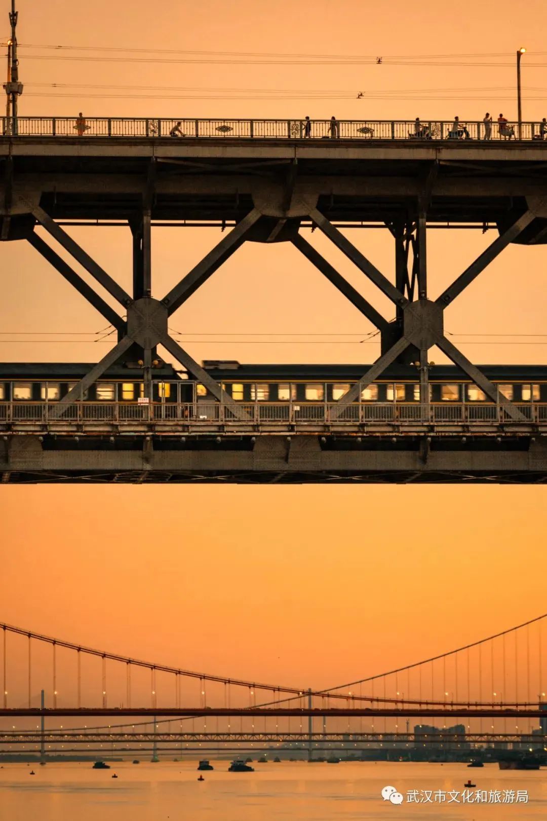余晖洒下,大桥被染上一层暖金色的光,金红色的光洒满江面,真的就是传说中的 “橘子海”! 波光粼粼,美到窒息。