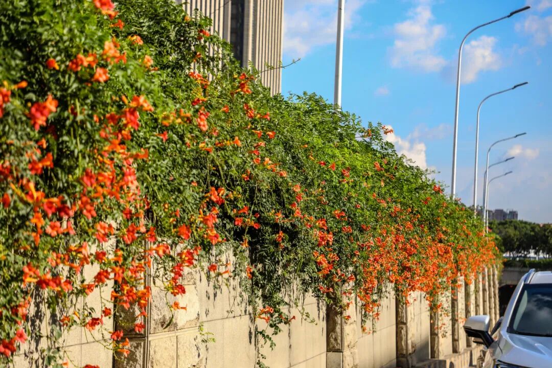 晨雾刚漫过武昌古城墙的垛口,中山路的凌霄花已顺着地下通道的围墙向下舒展。橙红色的喇叭状花朵缀满藤蔓,像一串串倒挂的小灯笼,又似孩童垂落的糖葫芦,在微风中轻晃,摇出“天风摇曳宝花垂”的禅意。