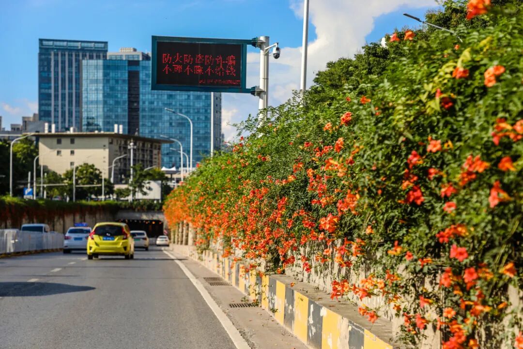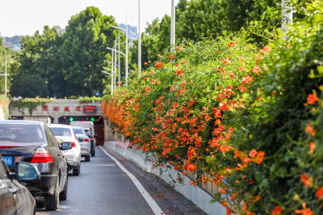东湖路水果湖隧道口两侧,是武昌“绣美花路”最灵动的一笔。武昌区城管执法局以“四季有花”为笺,让凌霄花的热烈与地被花卉展开一场时空对谈:地被层用超级海棠、天竺葵铺成花毯,连脚下的土壤都被细心雕琢成龟背状微地形,好让每一株花草都能晒足太阳。这份“空中花瀑+地面花毯”的立体养护智慧,让隧道周边成了“车在花浪里游,人在画框里走”的移动花园。
