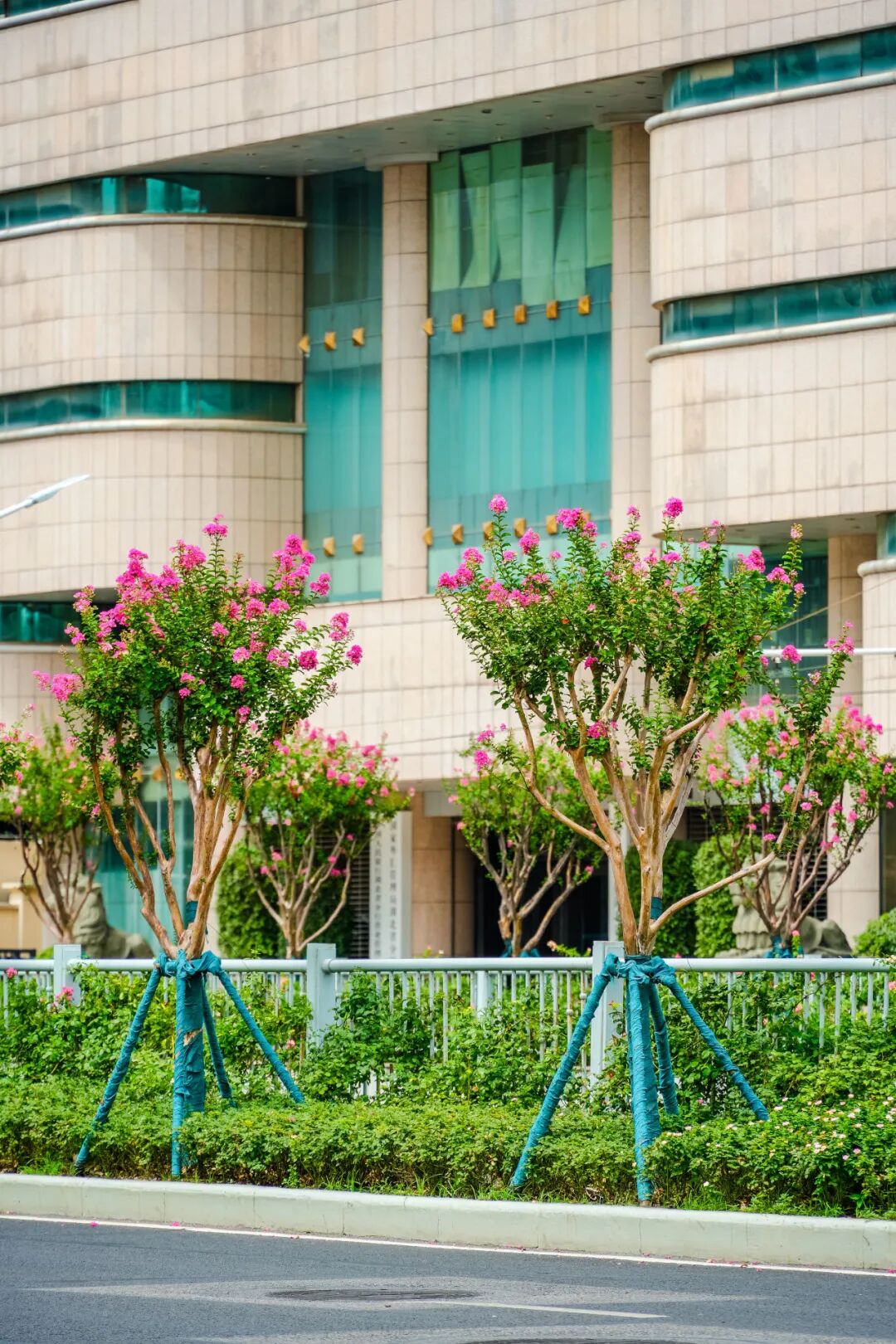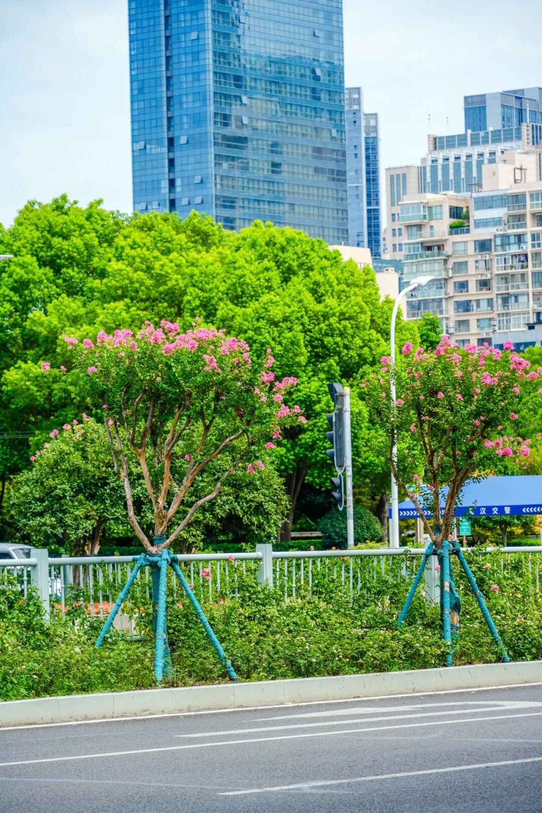 若说中山路的凌霄是古城的含蓄诗篇,中南路-中北路的紫薇便是都市的热情宣言。作为武汉“紫薇特色景观路”,这里的197株川红紫薇正肆意铺展:玫红色的花球缀满枝头,像打翻了的胭脂盒,为沿线道路注入滚烫的自然暖意。