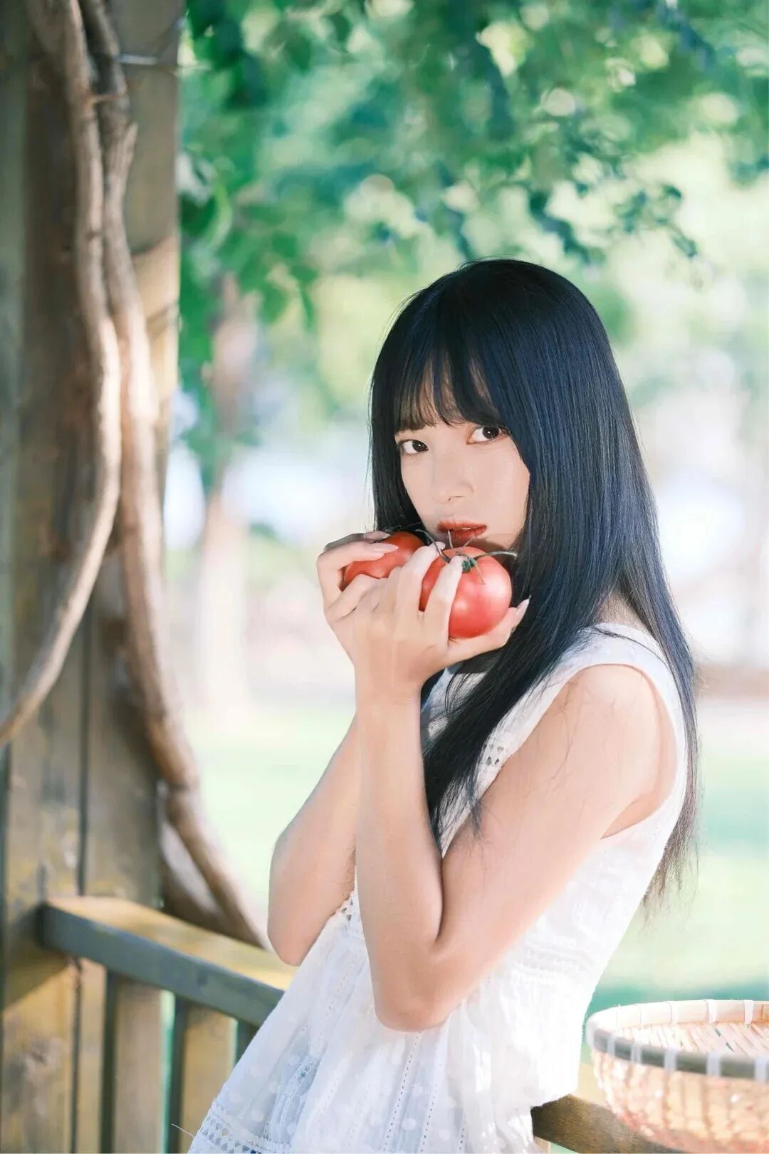 1、靠在小木屋的走廊上,看镜头、手捧番茄,拍摄半身。