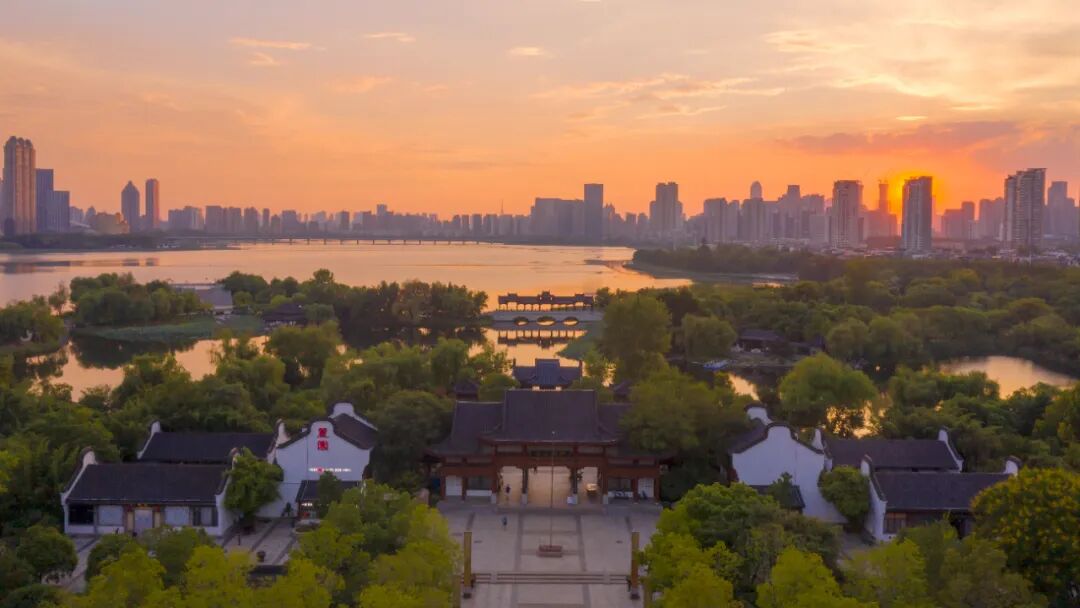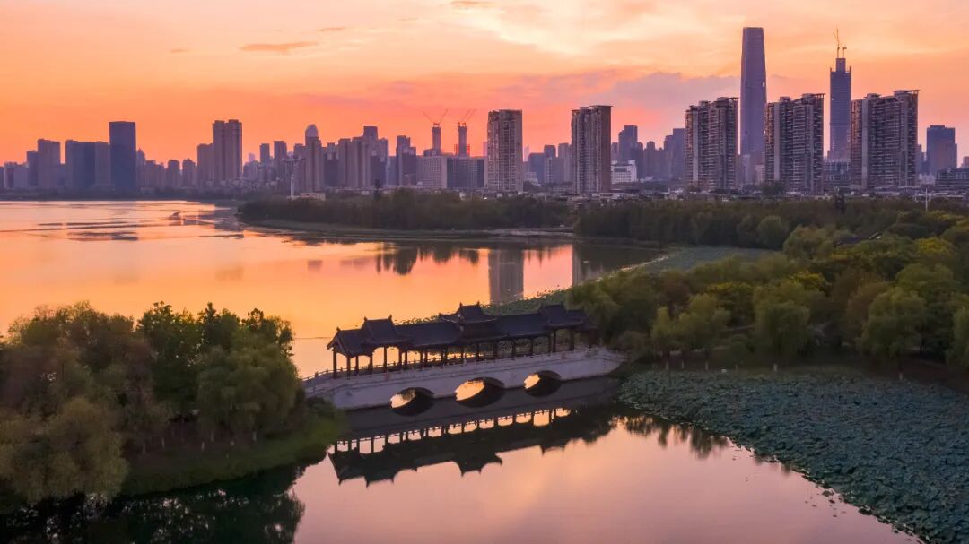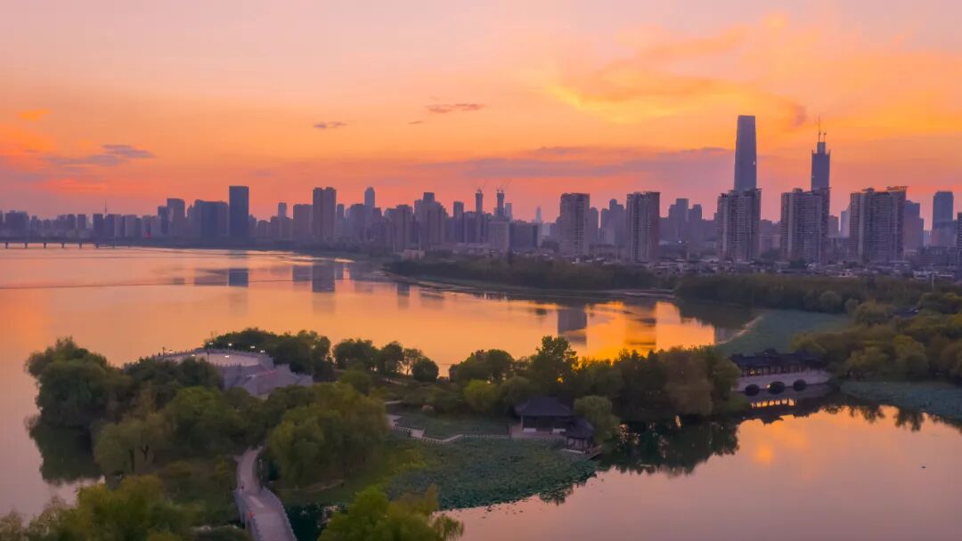 ⊙橘粉色晚霞包裹沙湖公园