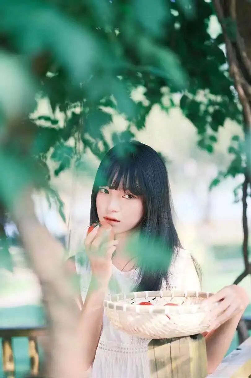 2、以绿植为前景,镜头聚焦脸部,不看镜头拍出随意感。