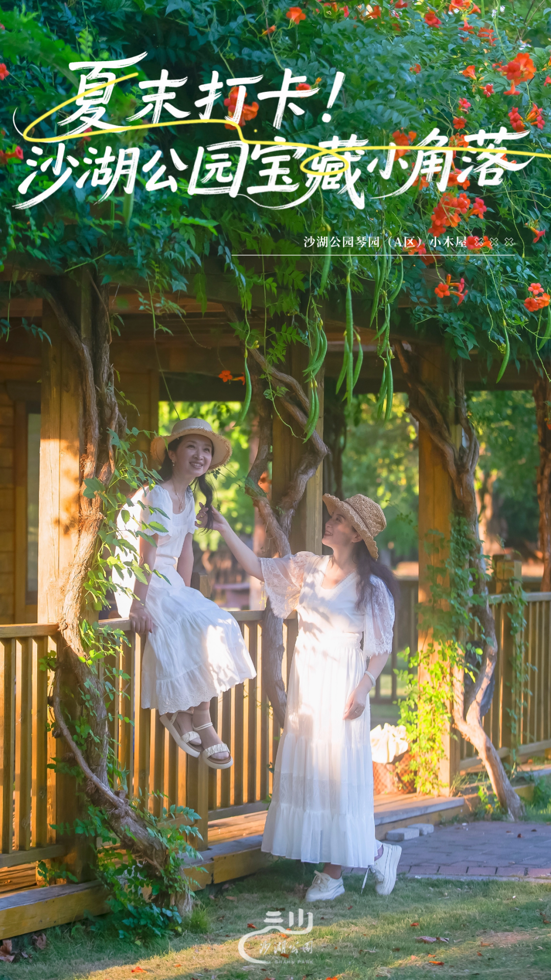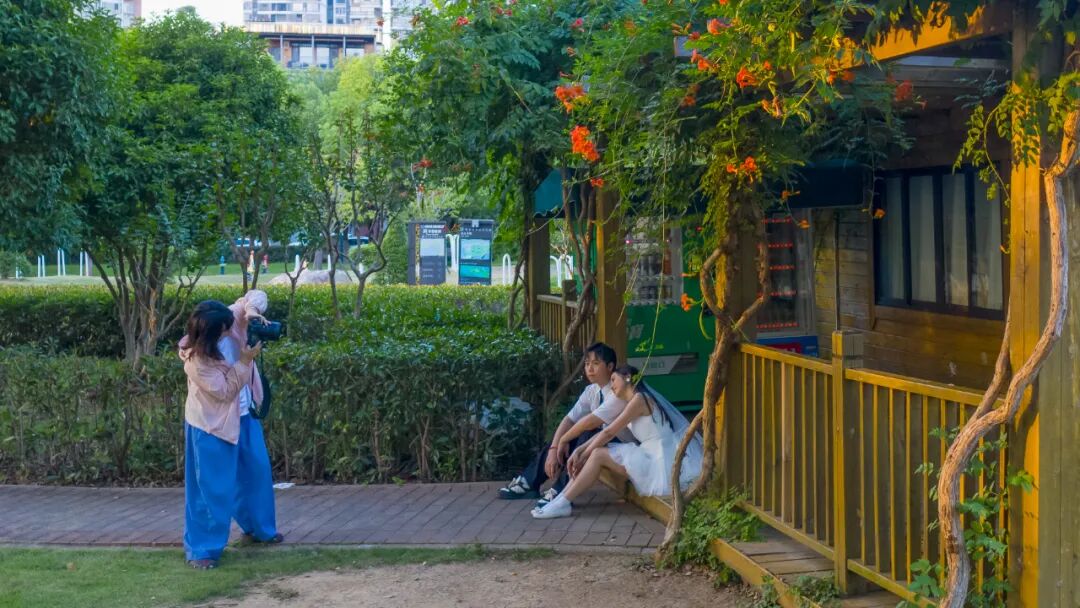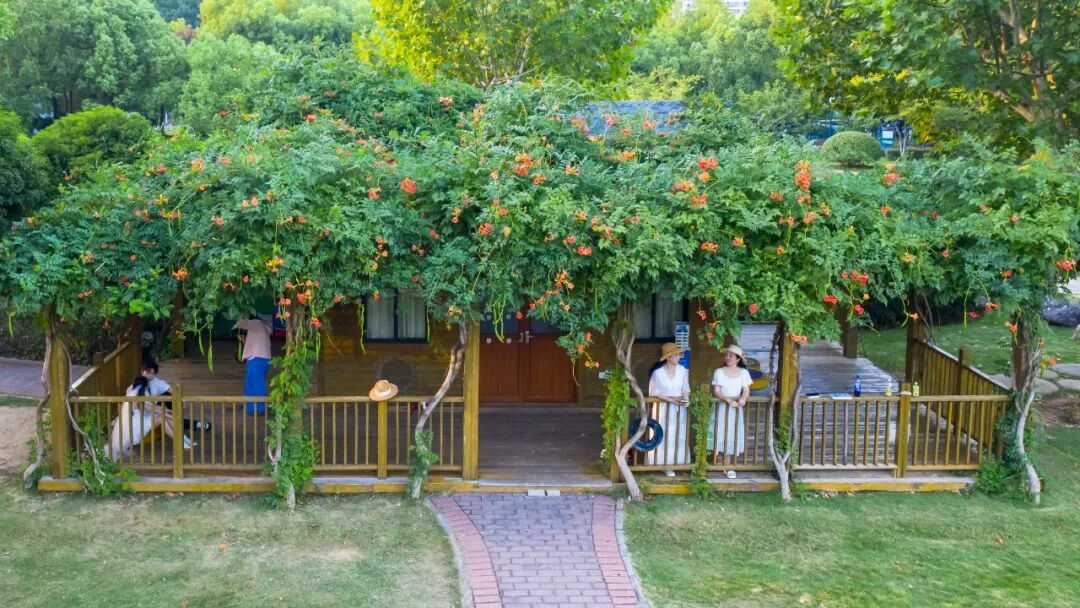 小木屋坐落在沙湖公园琴园(A区)梦想花园附近的湖边绿树之间,四周被野花和青草环绕,屋顶爬满红色的凌霄花,宛如童话里的秘密基地。