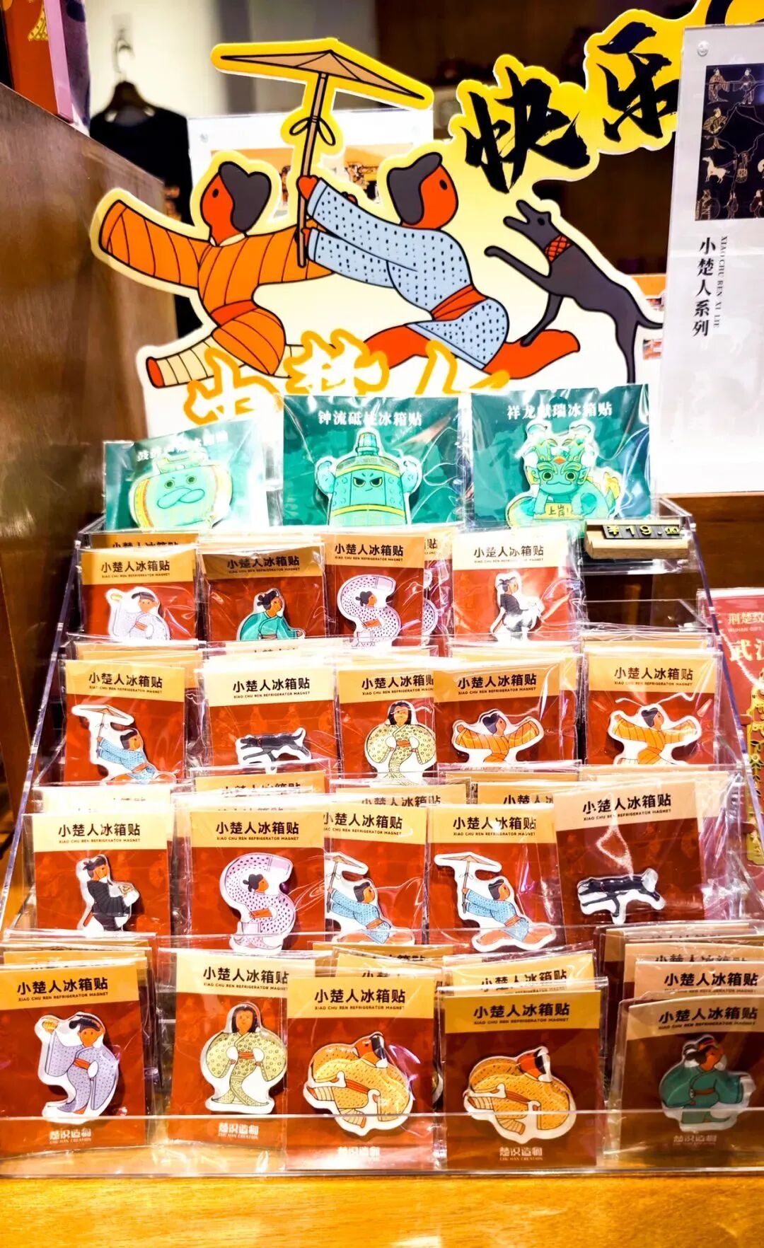 楚文化系列则提取文物元素,再现楚地浪漫。“小楚人”冰箱贴俏皮可爱,描绘楚人出行、宴请等9种生活场景。