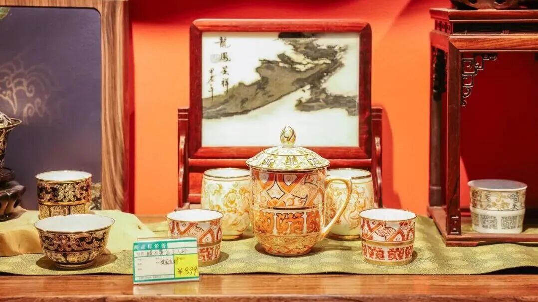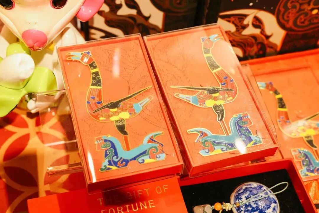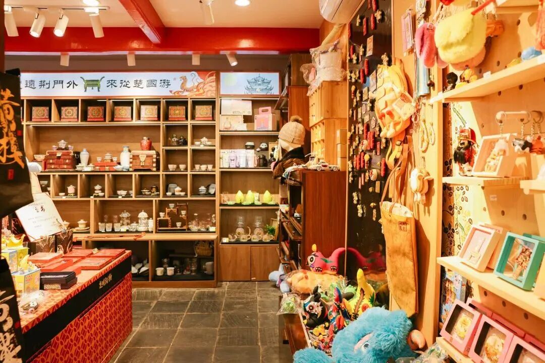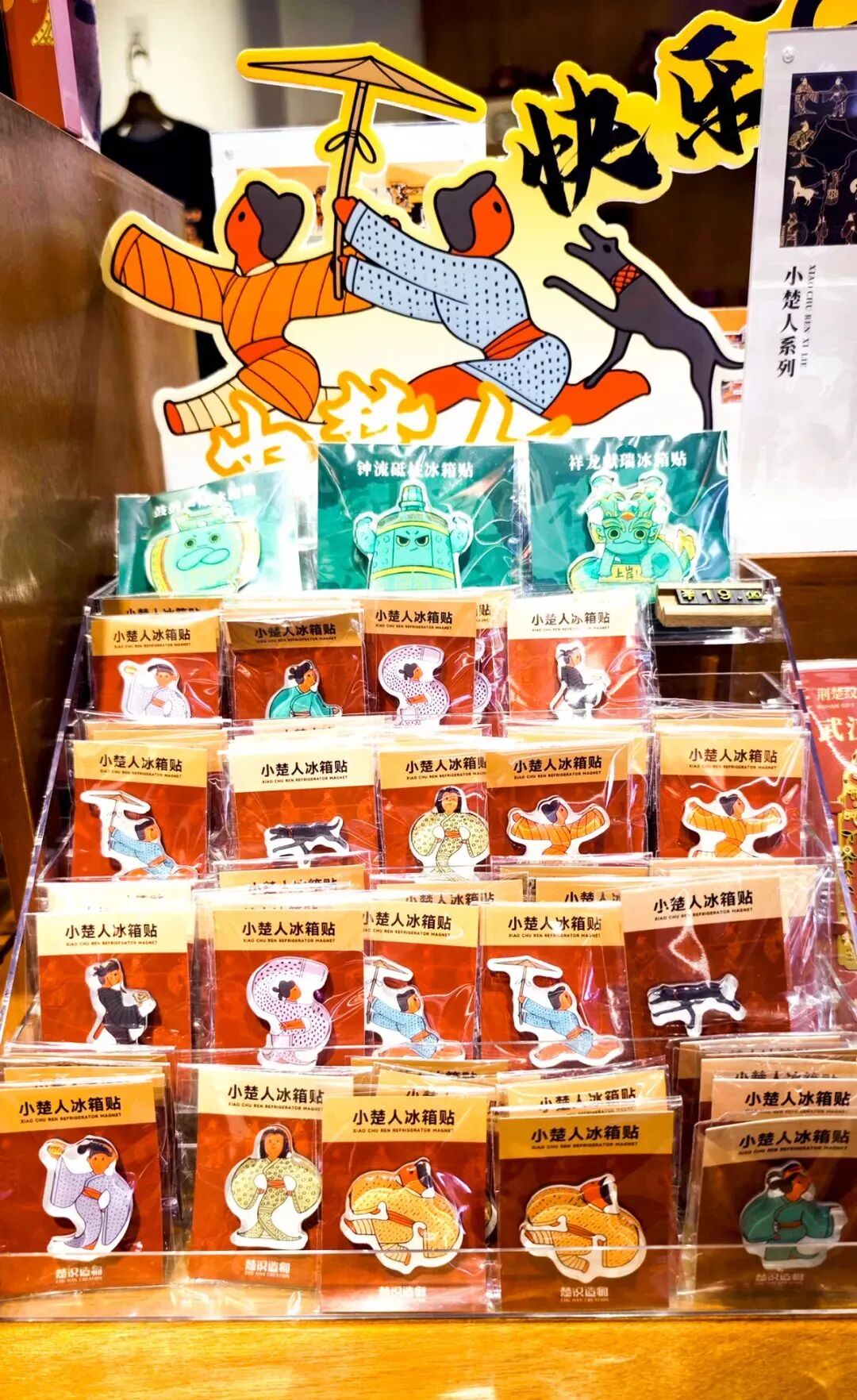 店中三开间,分文创礼物、服饰珠宝、茶水铺三大区域,上百件“楚国宝贝”琳琅满目:冰箱贴、书签、玩偶、发钗、团扇、陶瓷杯……它们均以文物、地标、楚国色彩等形式呈现,承载着楚国的诗意浪漫与文化底蕴,更是楚文化的新时代注解。