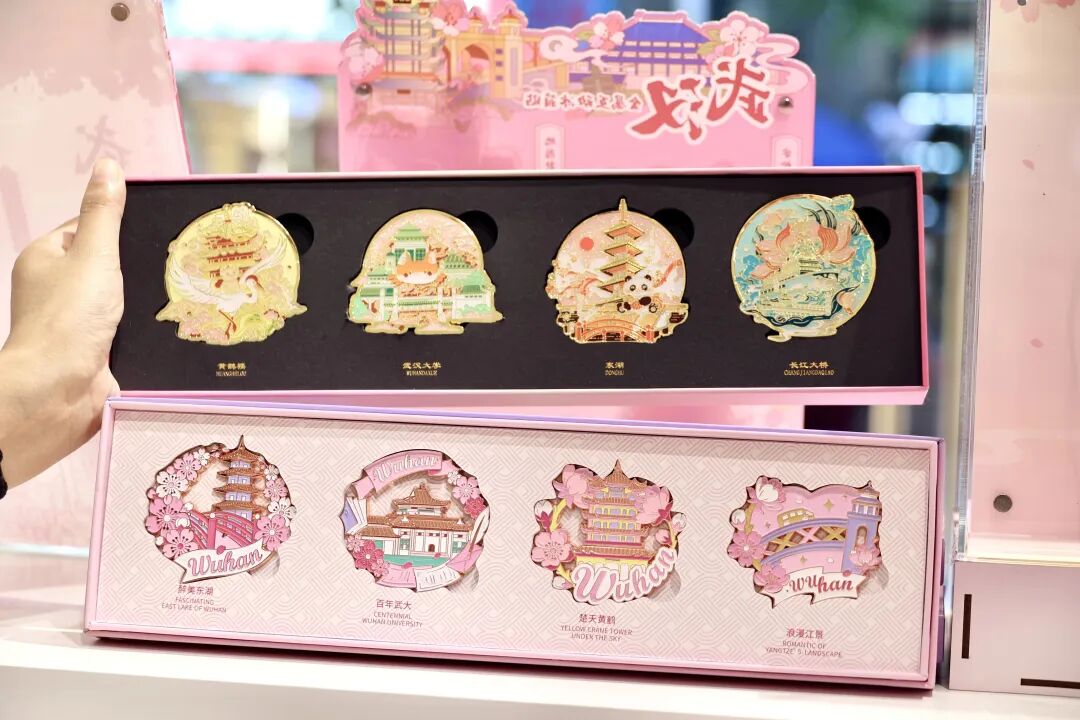 右侧则陈列着各类文创产品,“美好的黄鹤楼”系列中,冰箱贴、旋转纸灯、四季手链应有尽有。