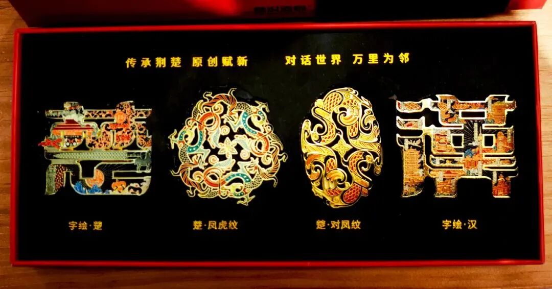 字绘楚汉产品则将地标、文物融入“楚”“汉”字形中,一个“楚”字就汇聚了11种楚文化元素,神秘且华丽。还有曾侯乙编钟、越王勾践剑、虎座鸟架鼓等“彩蛋”隐藏其中,等你来发掘。