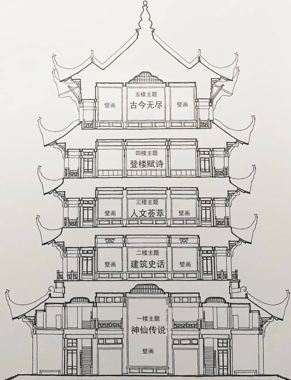 重建的黄鹤楼共5层,采用层层飞檐的设计,呈现出下隆上锐、形似筒状的姿态。既保留了古代黄鹤楼的建筑特征,又体现了现代建造工艺。