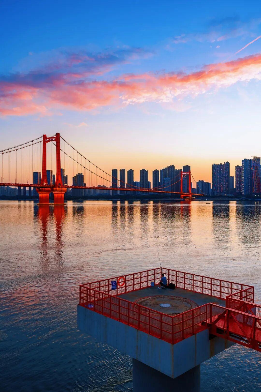 观景台深入长江中,橘红栏杆与鹦鹉洲长江大桥遥相呼应。黄色塔吊矗立在江边,呈现历经沧桑的工业风。巨型方框前,游客排队打卡,帧帧美若油画。