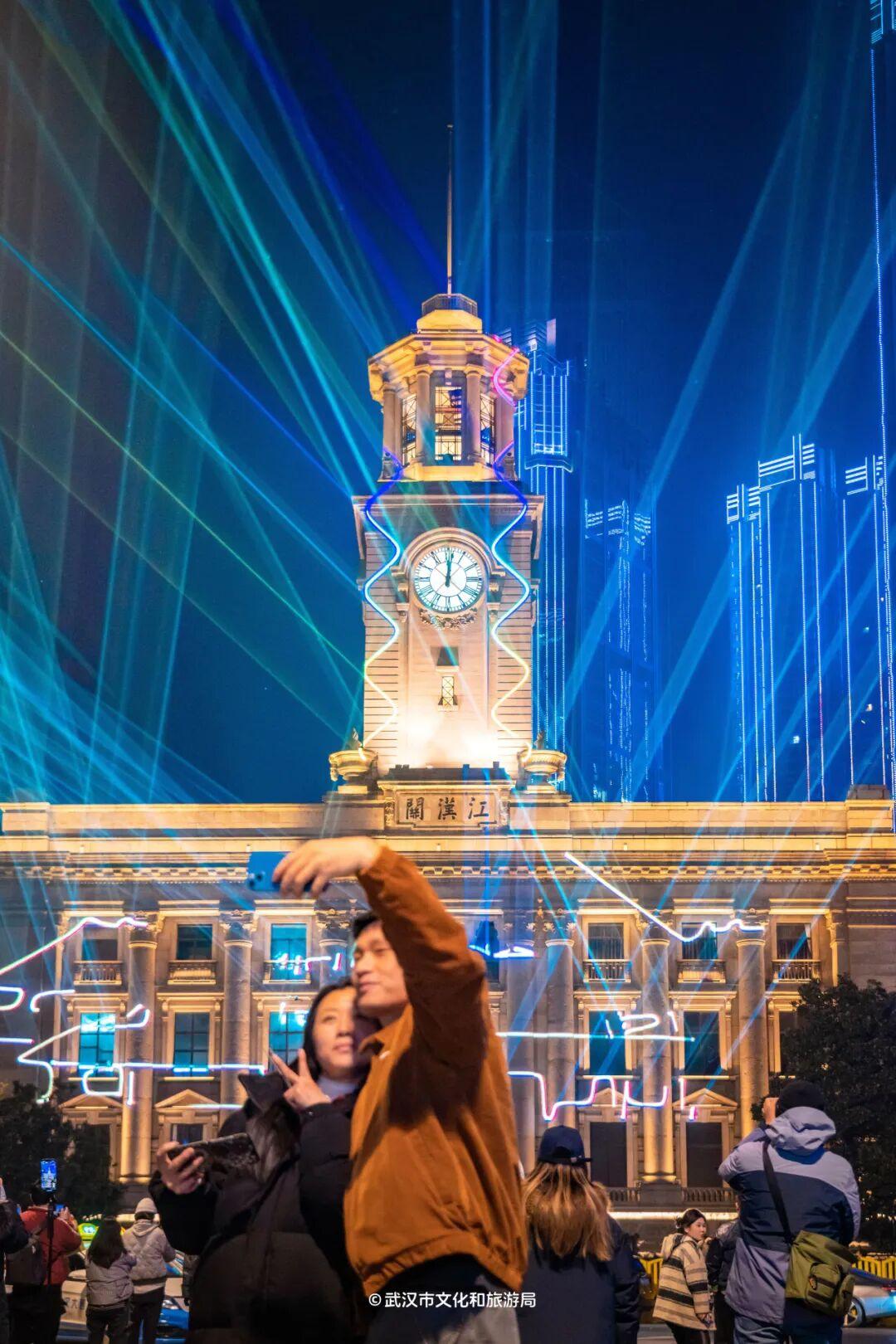 江汉关大楼举办“激光秀+交响乐+钟声”的跨年盛典;黄鹤楼、龟山电视塔、晴川阁等地标启动灯光秀倒数;两江四岸12幢楼宇联动桥梁,激光同频空中绽放,将跨年秀推向高潮……