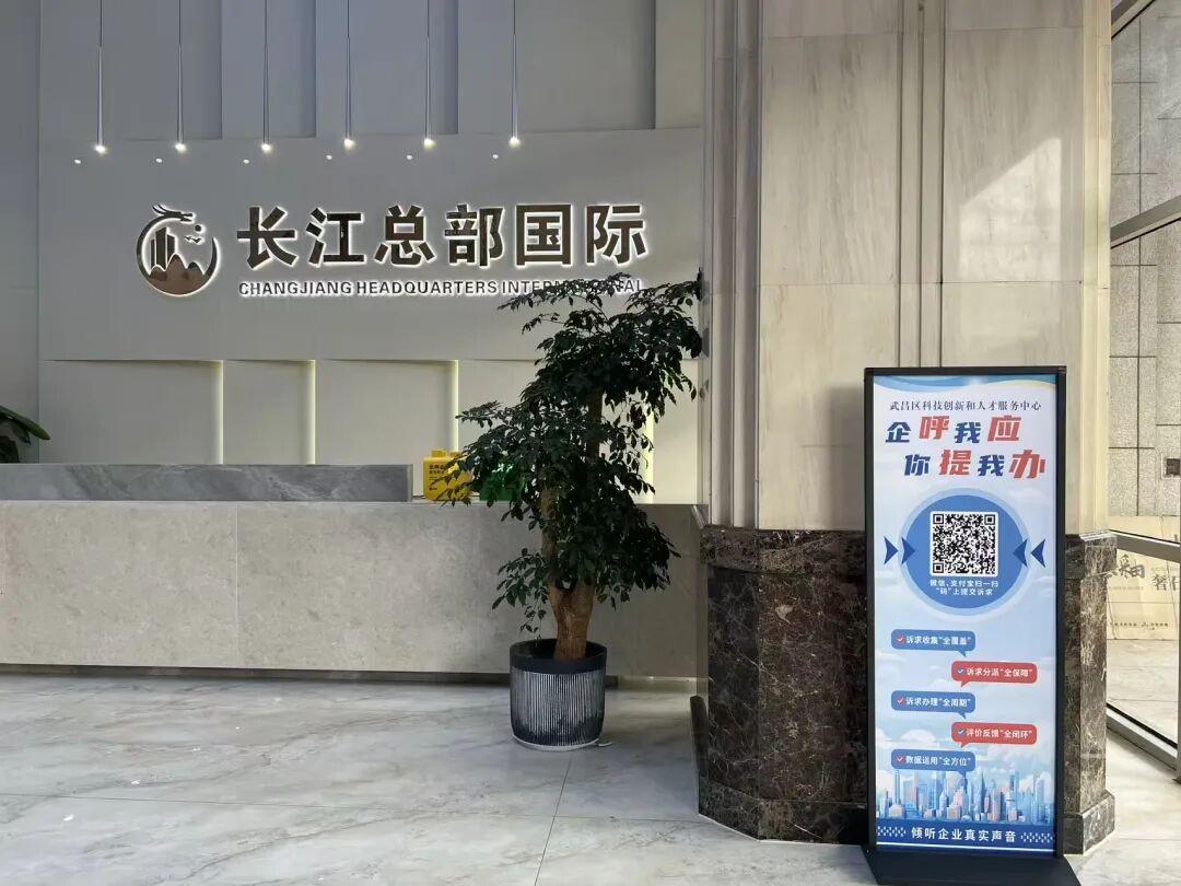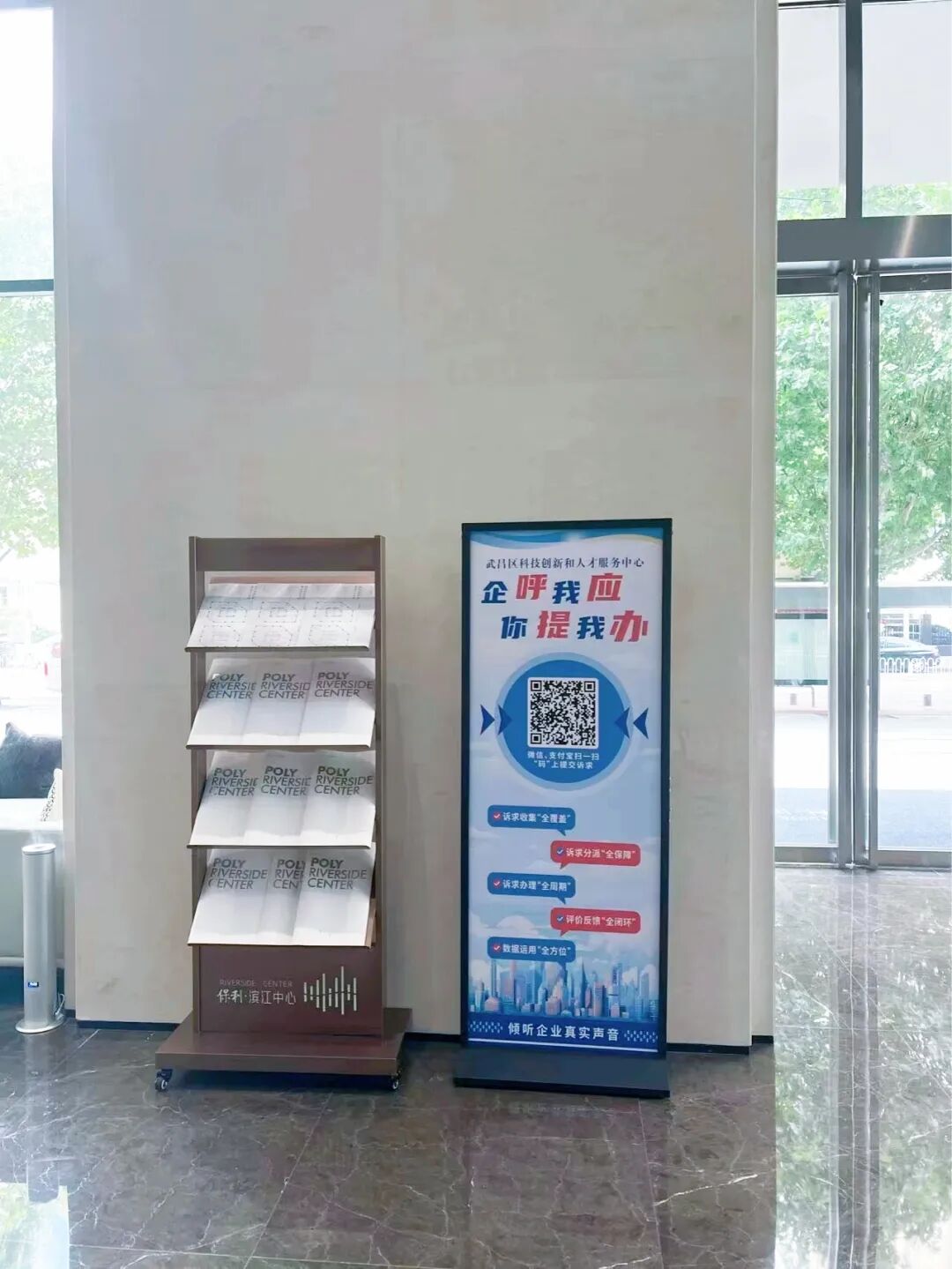 试运行后,平台在10栋重点楼宇和2个特色园区开展为期三个月的试点。不同于传统服务标识的“低调摆放”,武昌区为平台专门设计了蓝白配色的标准化服务牌——牌面中央“企呼我应”二维码清晰醒目,下方“码上提、马上办”的字样直击企业需求,每栋楼的大厅前台、电梯口、园区服务中心等企业高频活动区域,都能看到这些服务牌的身影。