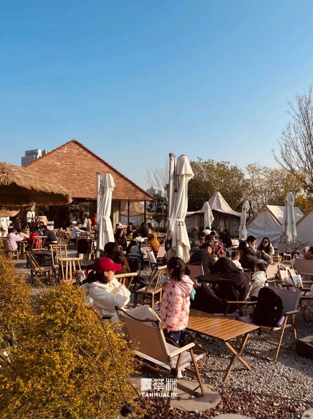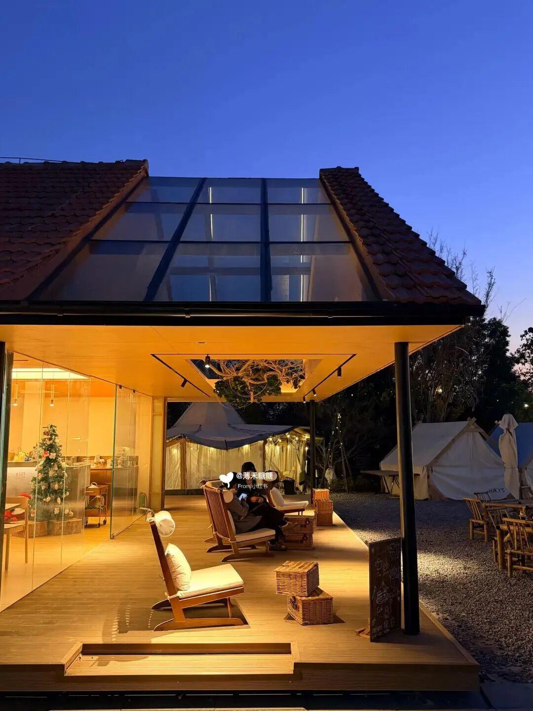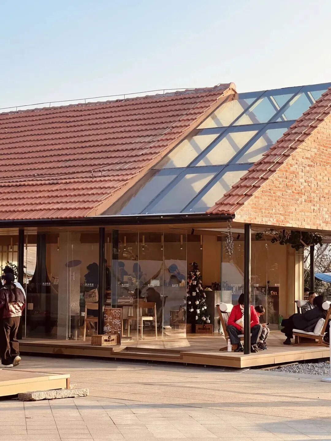 城墙茶馆以红砖与原木构筑,嵌入整面玻璃天窗,引入冬日暖阳。户外平台直面城景,室内陈设温馨,氛围松弛。周五下午,年轻人陆续到来。